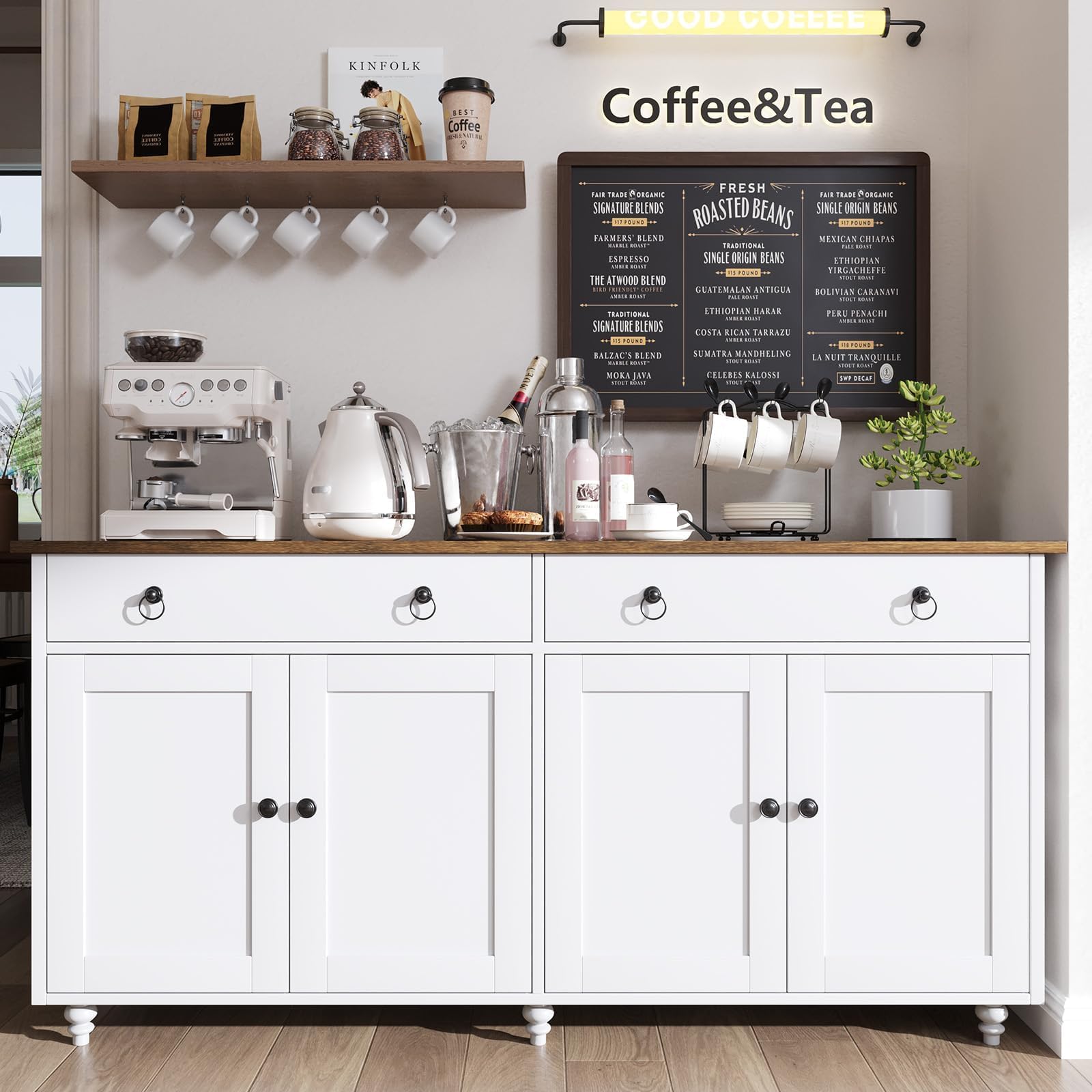 - Large Storage Space: Coffee bar cabinet with adjustable shelves on both sides for flexible storage of various household items, two drawers to keep other kitchen clutter in order, spacious tabletop place a coffee pot or microwave oven