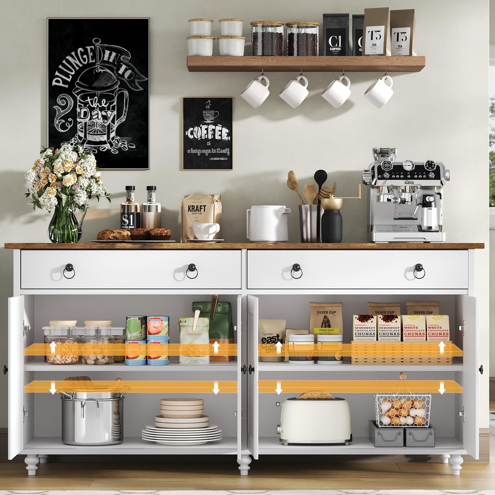 **55" Buffet Cabinet with Storage, Sideboard with 2 Drawers and 4 Doors, Modern Farmhouse Coffee Bar Cabinet, Wood Buffet Table for Kitchen or Dining Room, White**