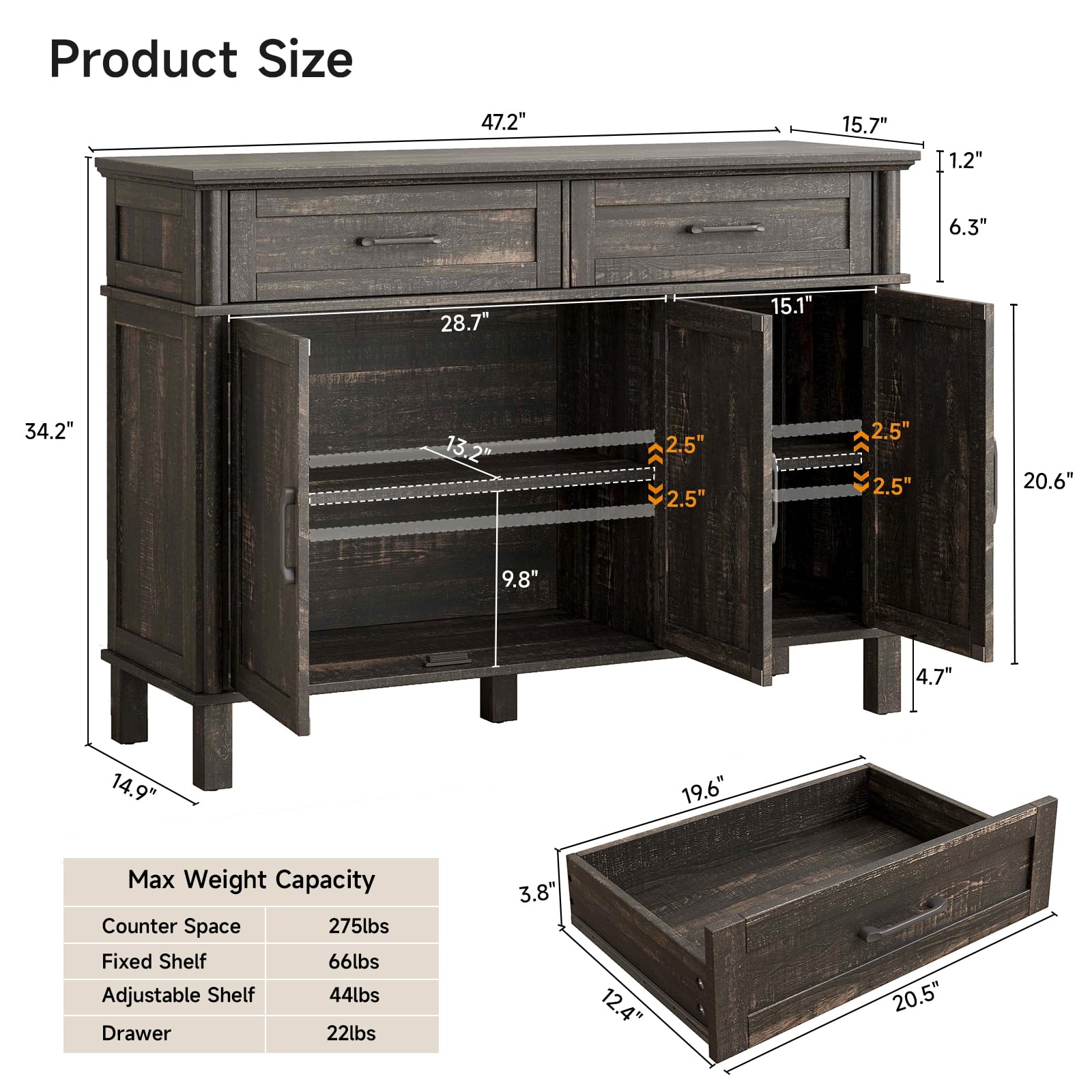 - CRAFTED TO LAST: This sideboard buffet cabinet with storage is made of high-quality manufactured wood and smooth-gliding rails, which have reliable stability and durability. 5 thickened legs provide reliable stability for the dining room cabinet