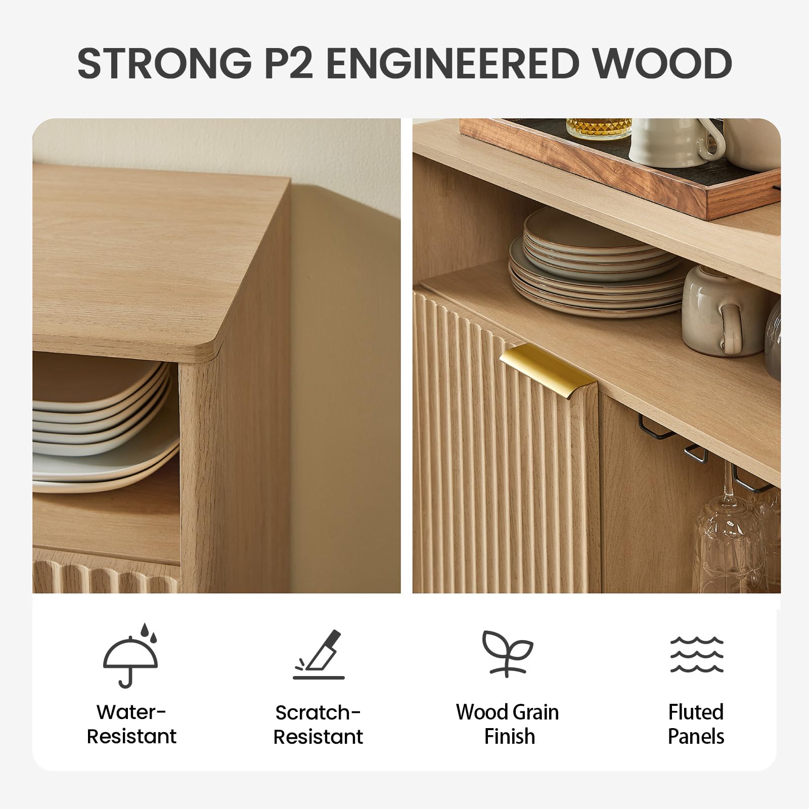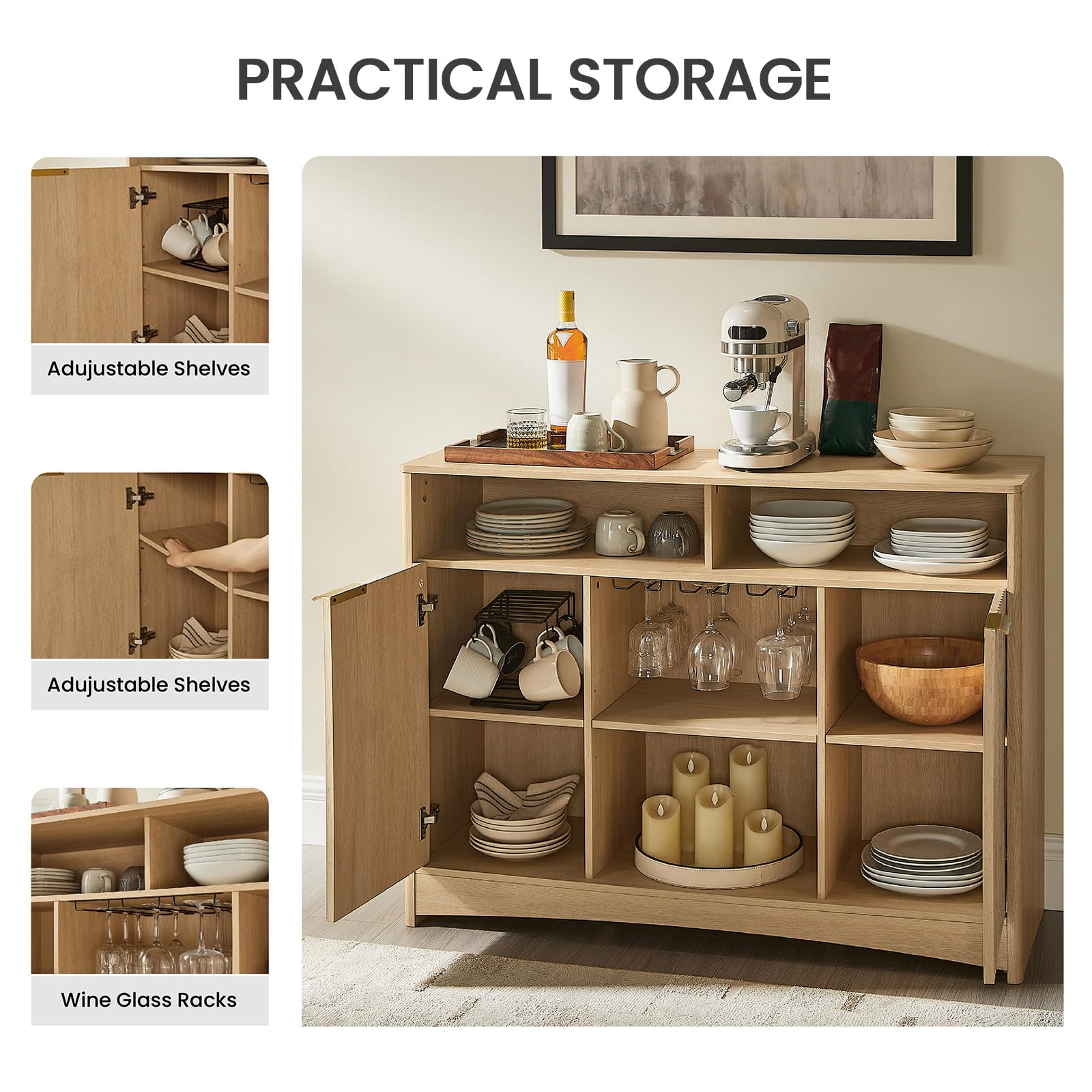 Coffee Bar Cabinet with Wine Glass Rack, 47" Buffet Sideboard with Adjustable Shelves and Soft-Close Hinges, Holds 200 lbs, Natural Oak