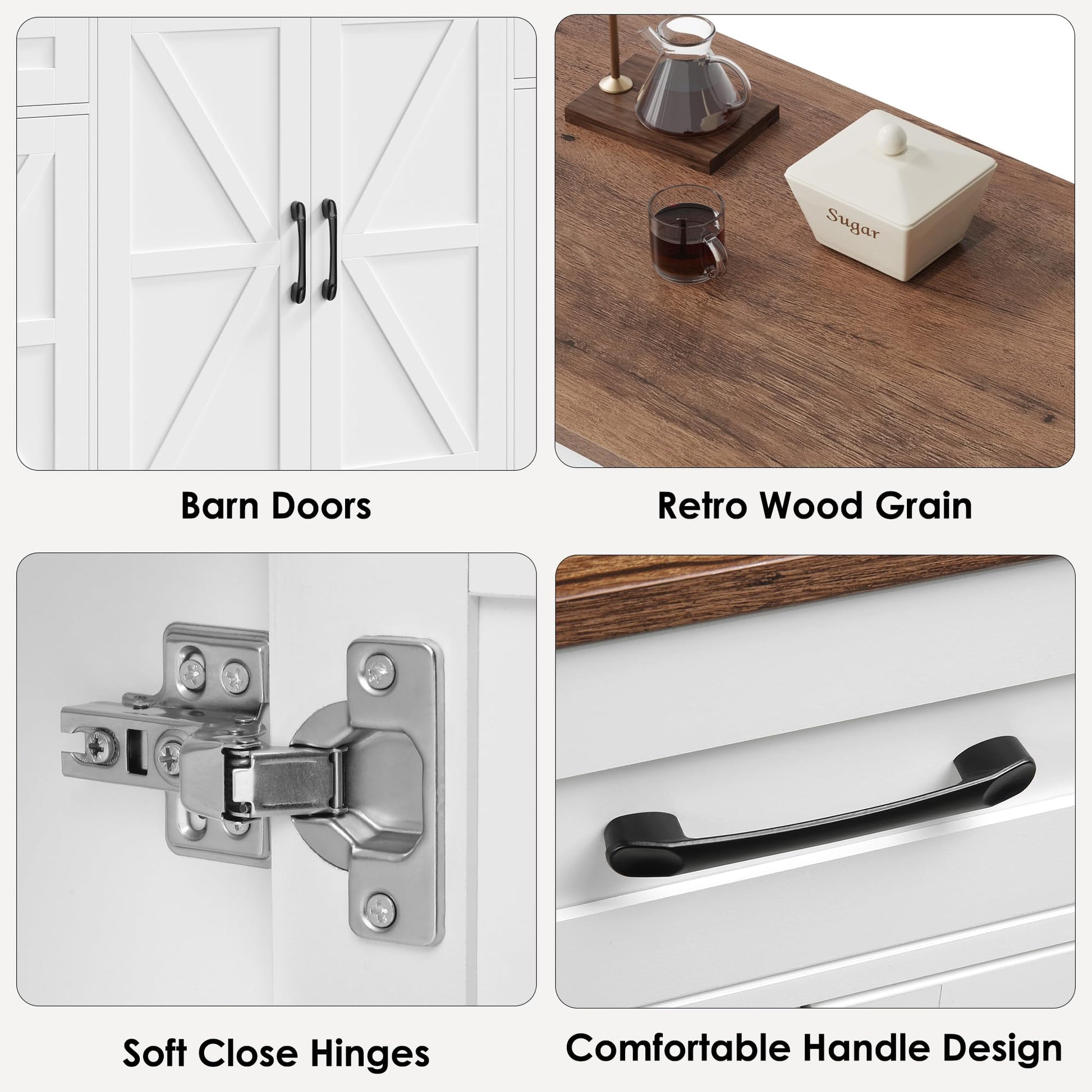 - Classic Farmhouse Charm: A white buffet sideboard brings elegance to your home. The handcrafted X-shaped barn doors and sleek metal handles create a timeless farmhouse look that complements any décor