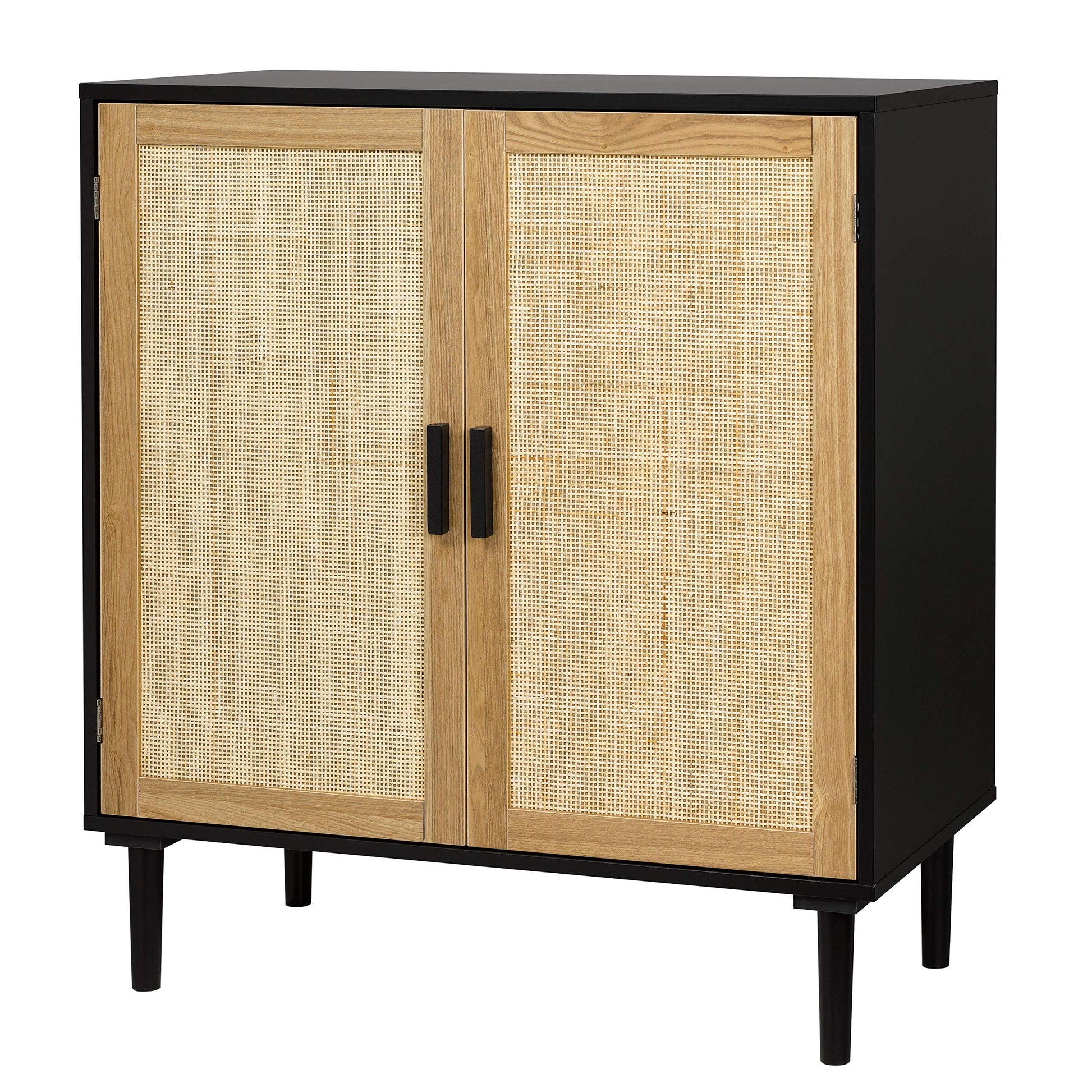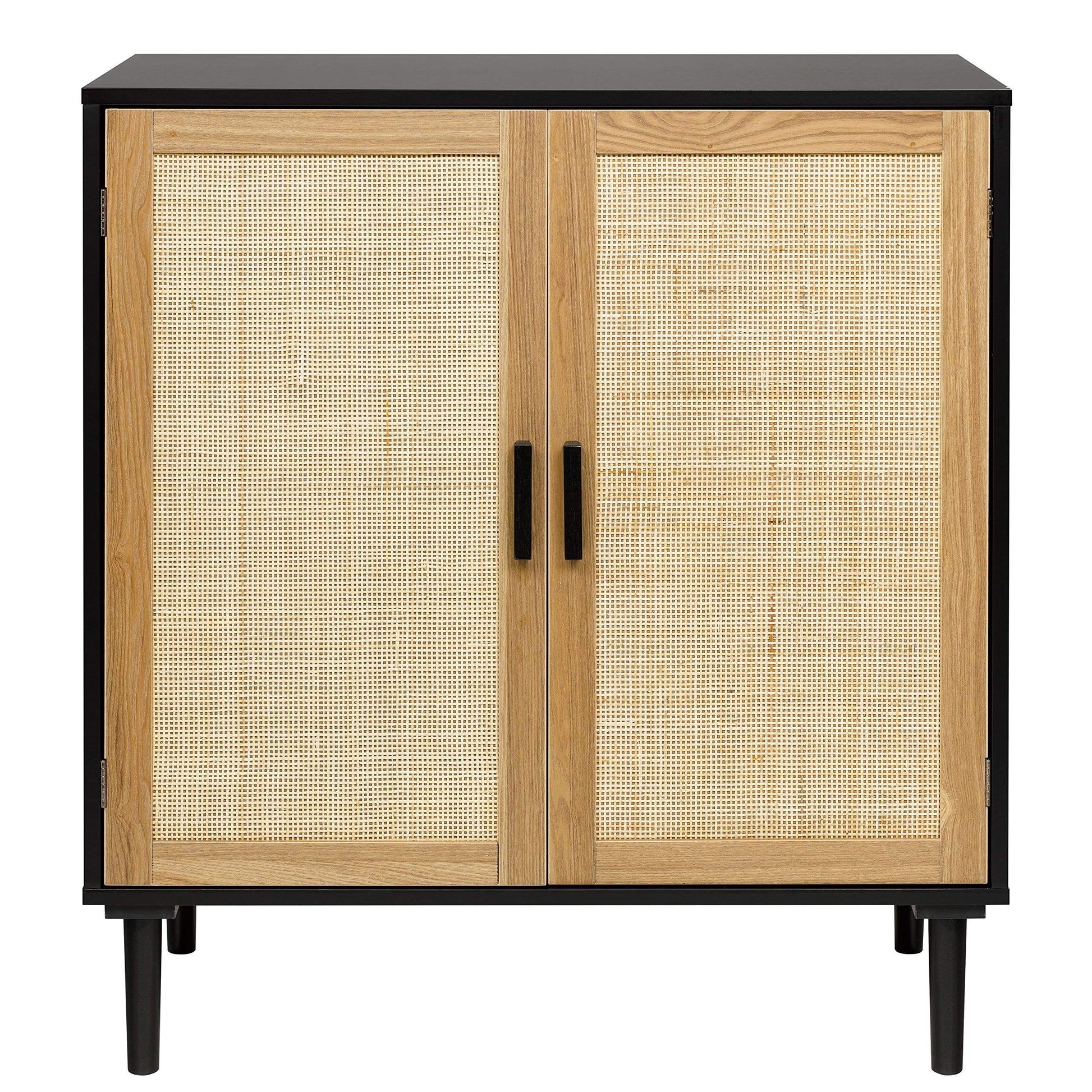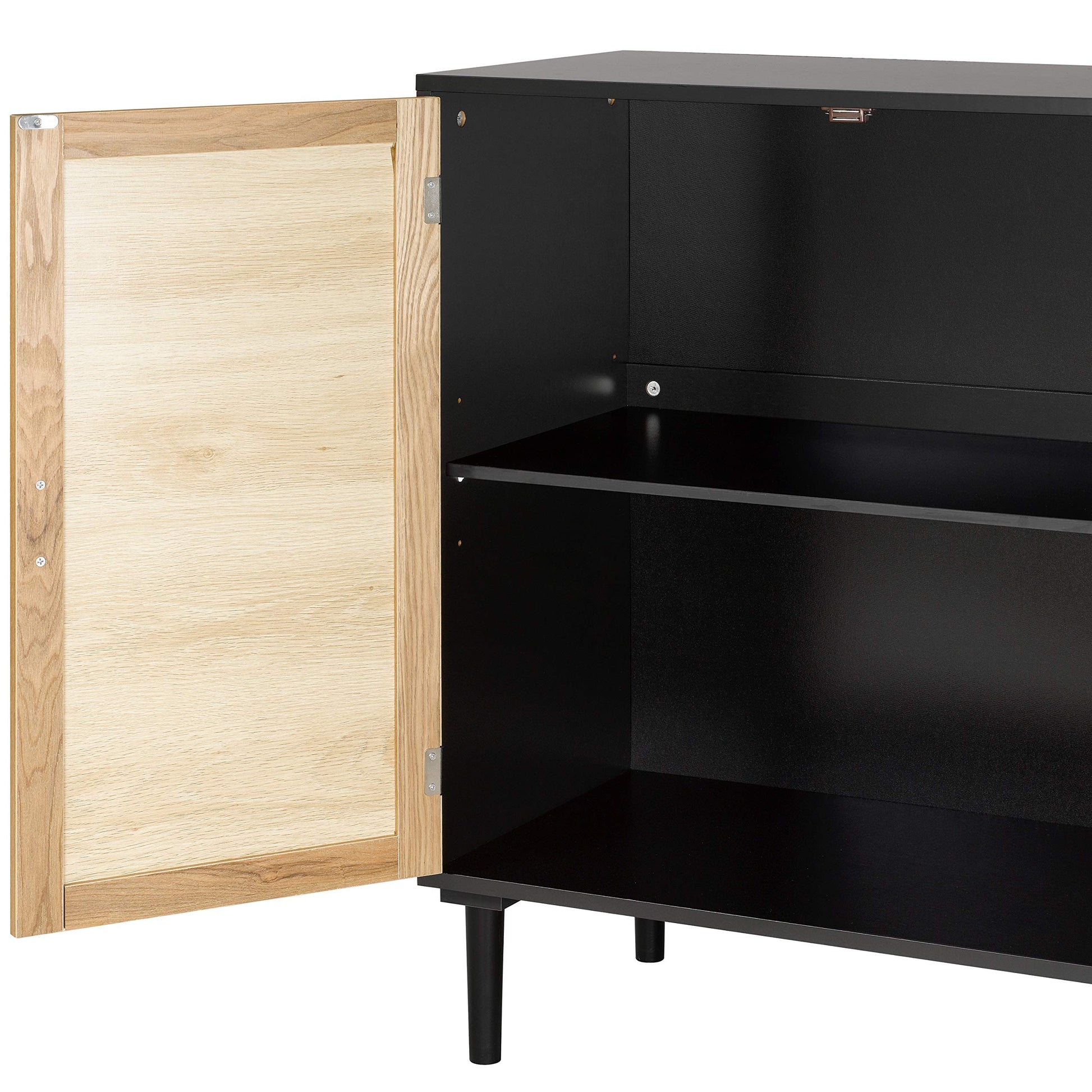 - 【MULTIFUNCTIONAL CABINET】 - All-purpose storage cabinet can meet your various storage needs as a sideboard or buffet server cupboard in dining room or kitchen. Waterproof paint on the cabinet surface with natural rattan decorated door can effectively prevent moisture so it can also used as a bathroom floor cabinet. The classic black cabinet and wood color doors combined retro and modern, it can be suitable for various styles of home decoration, adding a touch of unadorned elegance to your space.