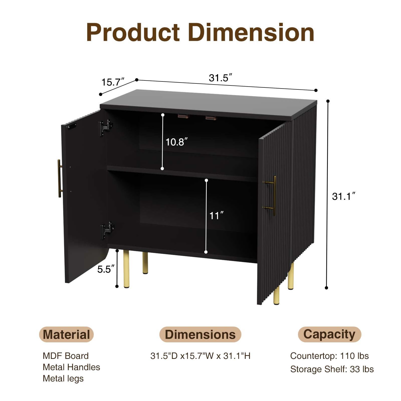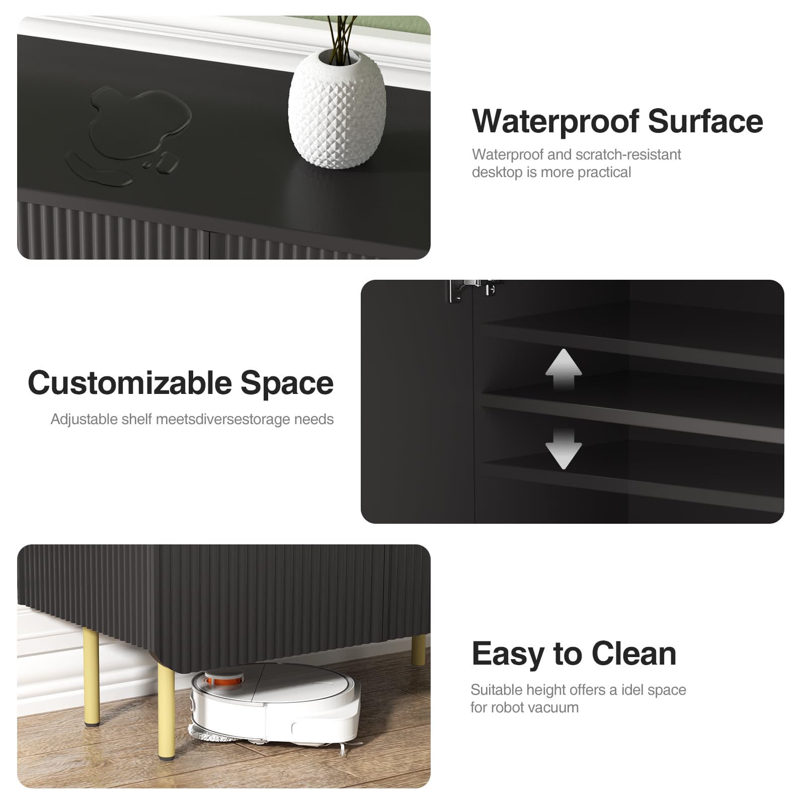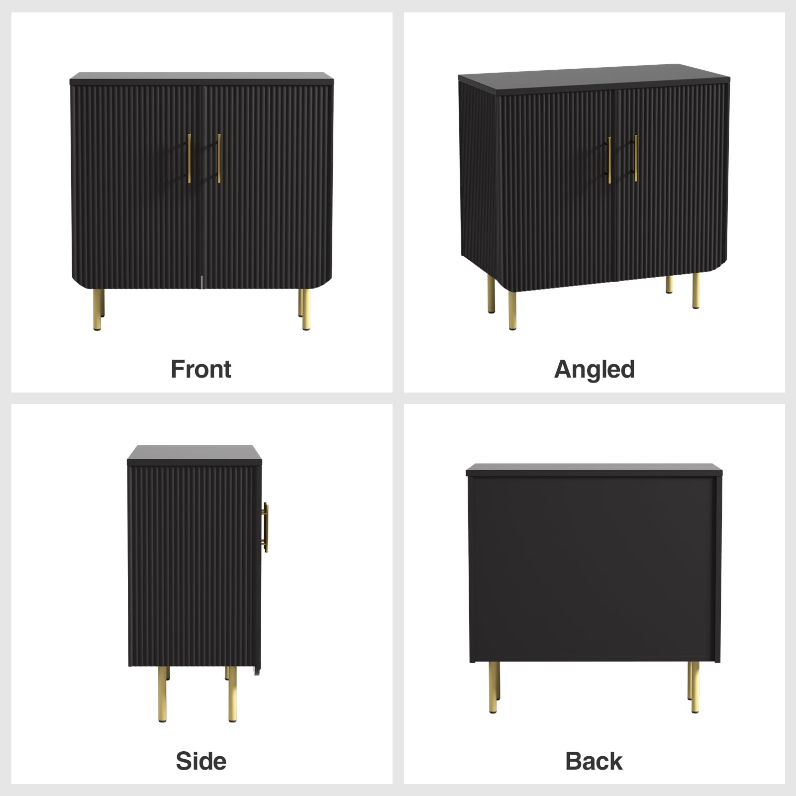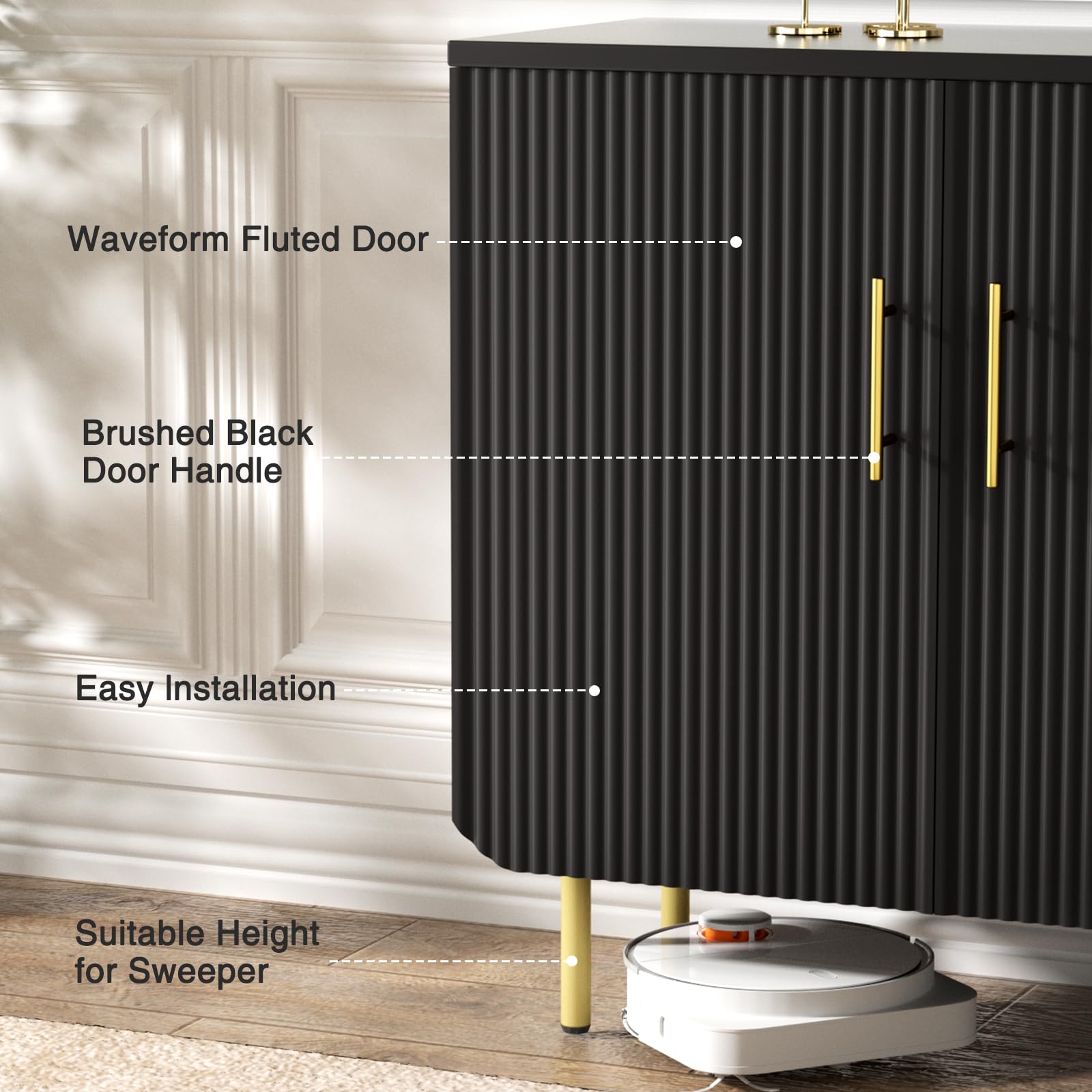 - Elegant Fluted Design: This modern buffet cabinet boasts a distinctive textured design with elegant wave-like panels, adding a touch of sophistication and style to your space. Paired with sleek gold metal handles, it creates a premium and contemporary aesthetic, seamlessly enhancing any room's decor. Perfect for both modern and traditional settings, this black storage cabinet is an exquisite statement piece for your home.