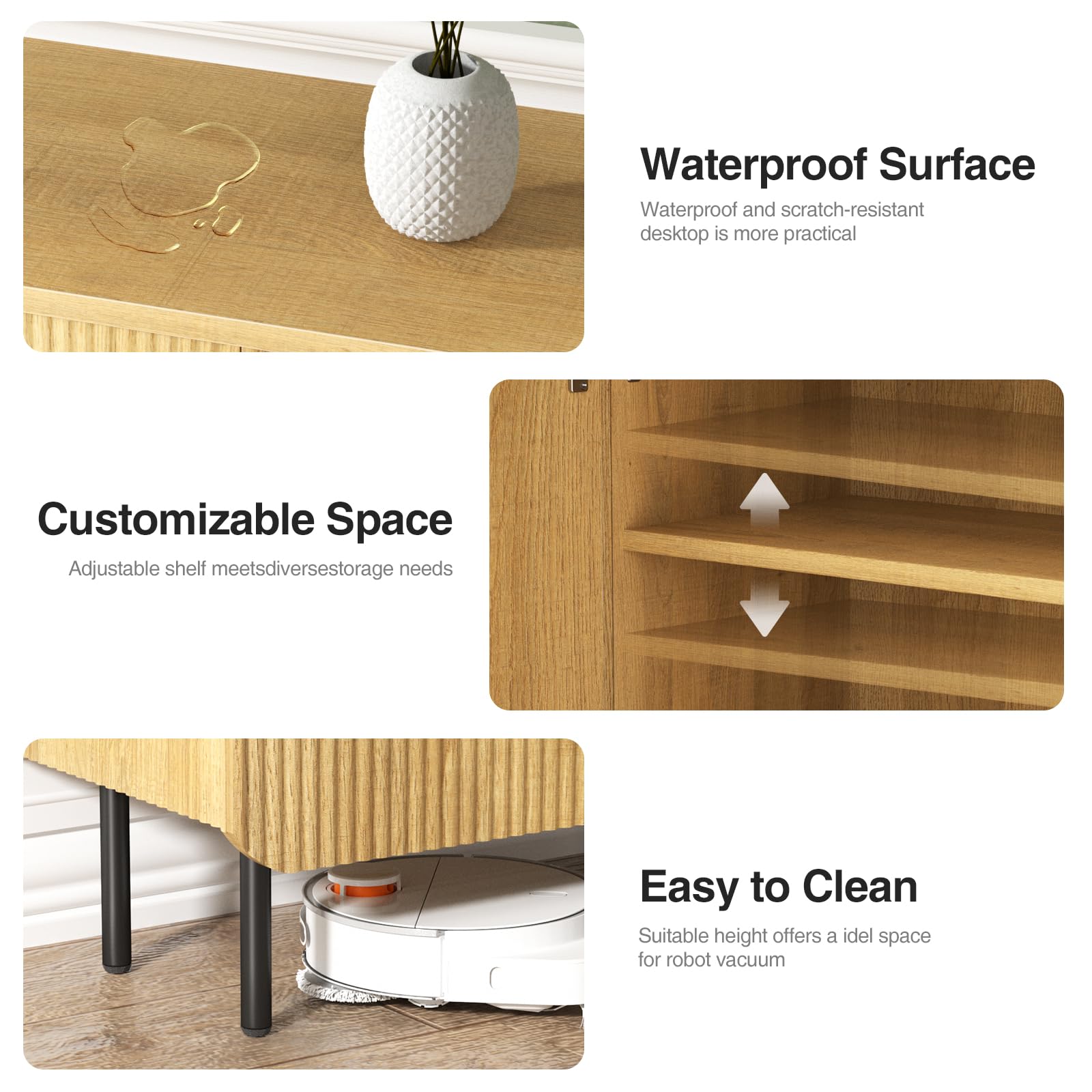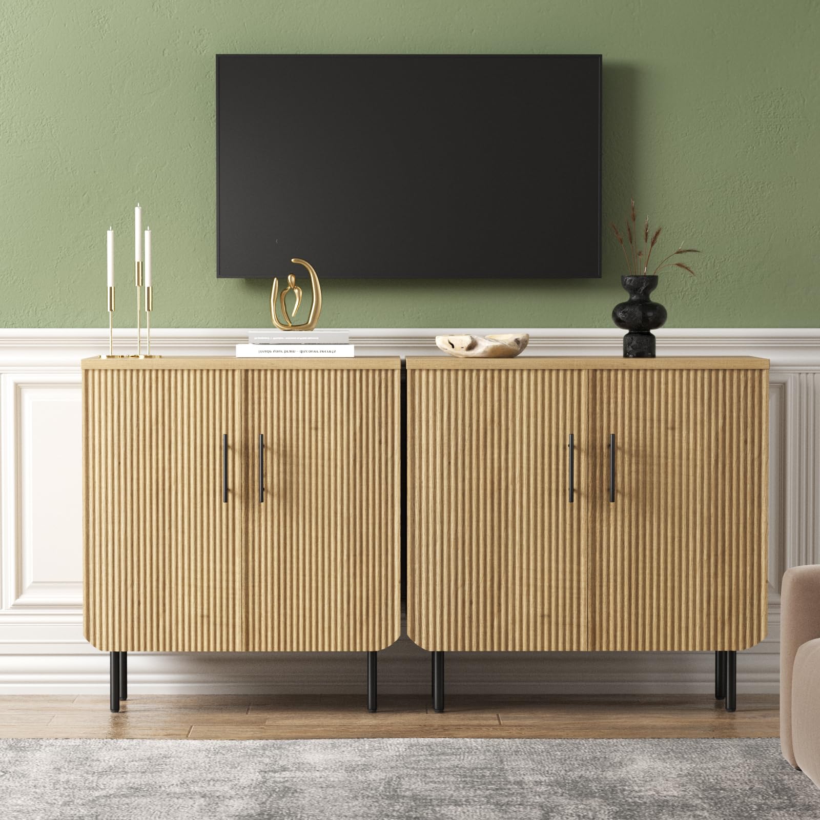 - Elegant Fluted Design: This modern buffet cabinet boasts a distinctive textured design with elegant wave-like panels, adding a touch of sophistication and style to your space. Paired with sleek black metal handles, it creates a premium and contemporary aesthetic, seamlessly enhancing any room's decor. Perfect for both modern and traditional settings, this natural storage cabinet is an exquisite statement piece for your home.