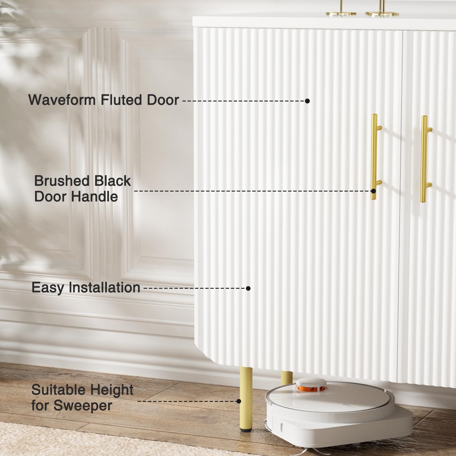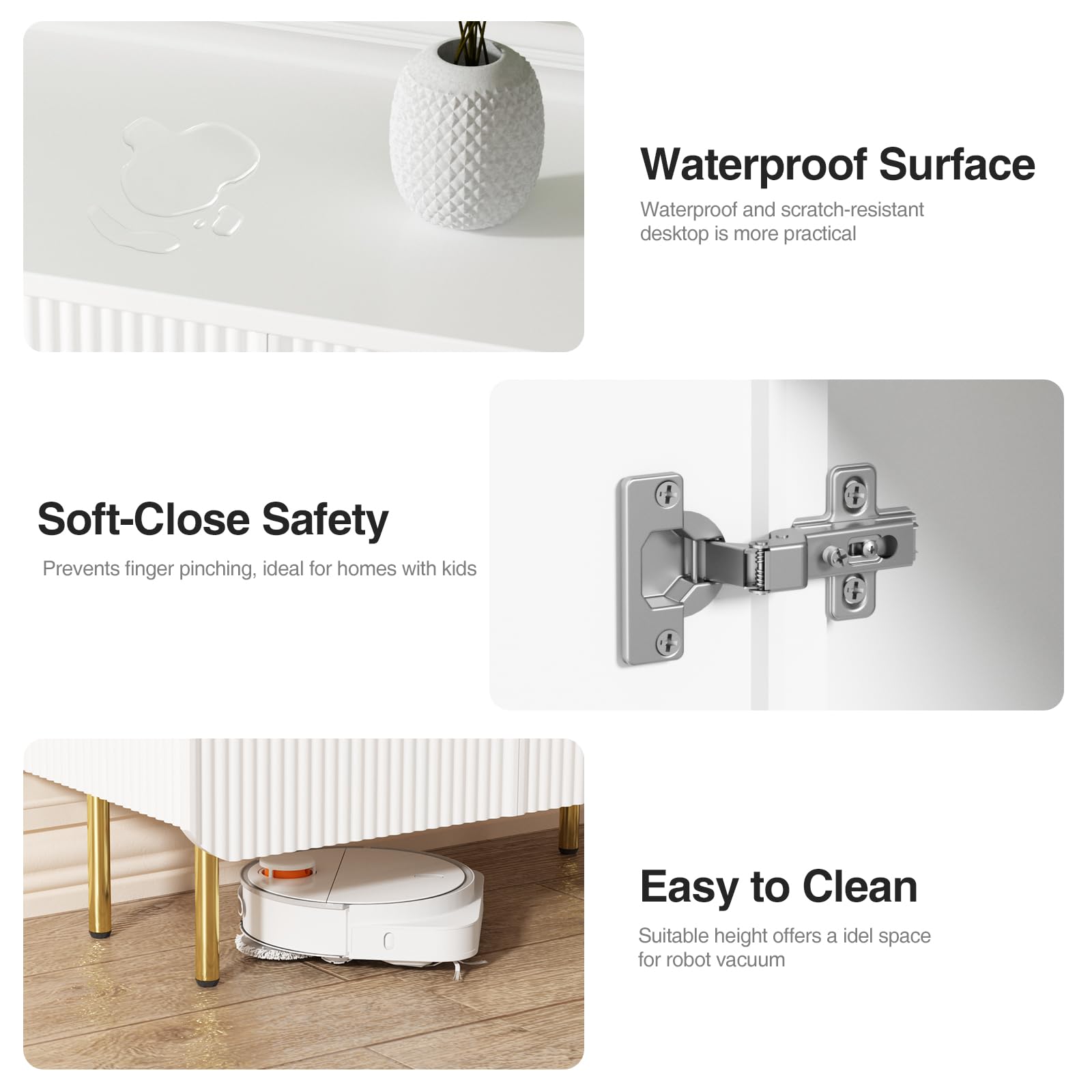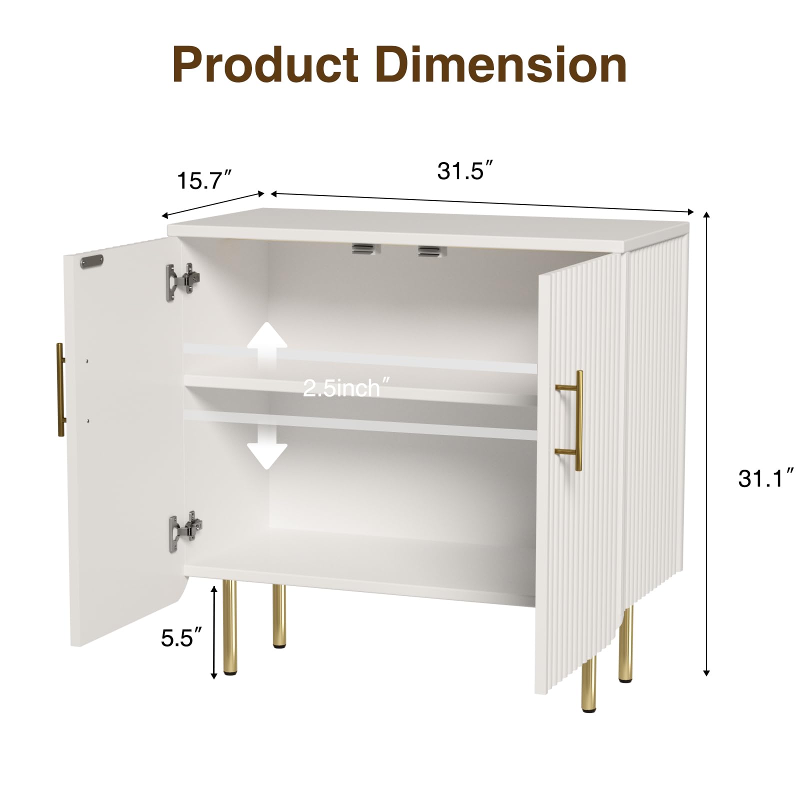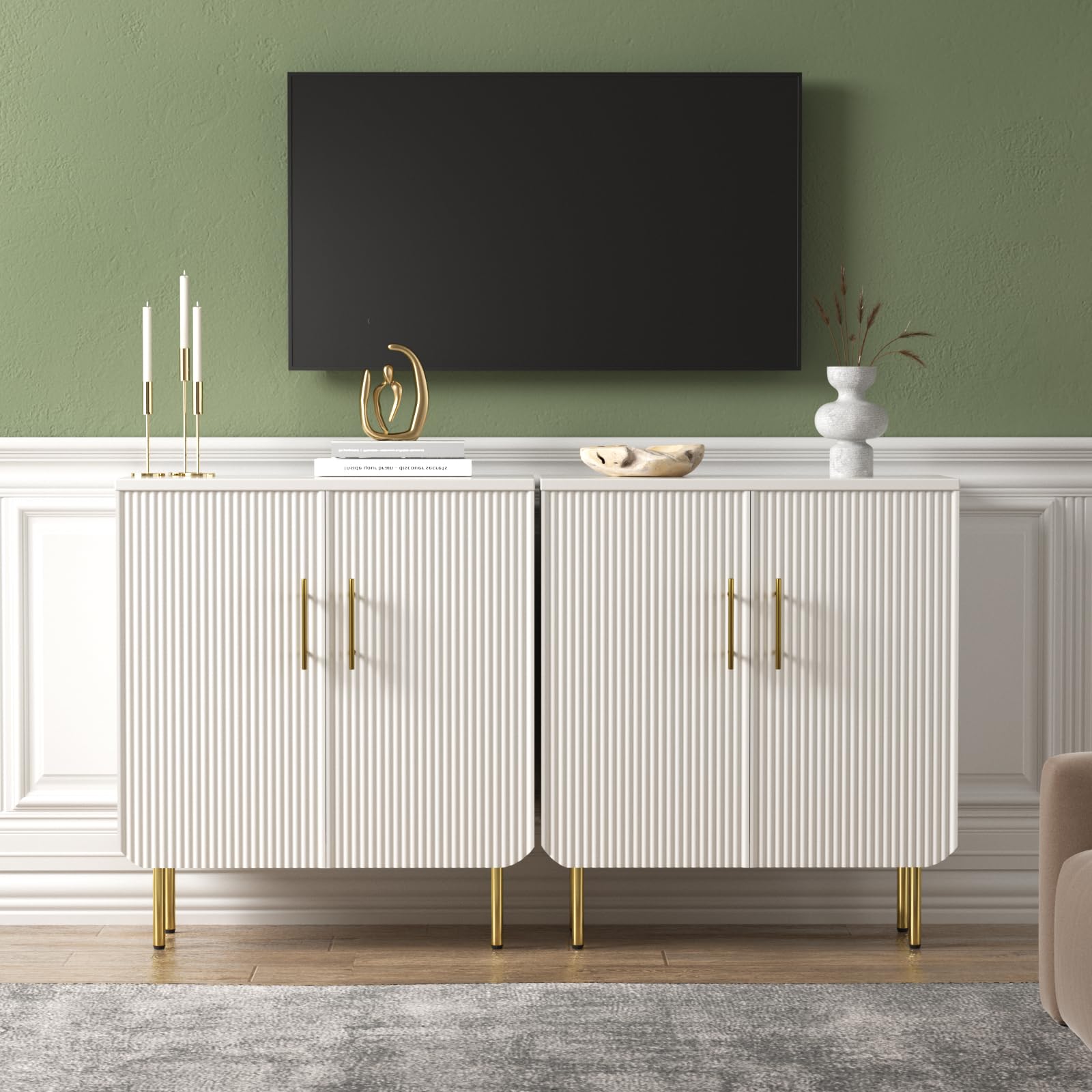 - Elegant Fluted Design: This modern buffet cabinet boasts a distinctive textured design with elegant wave-like panels, adding a touch of sophistication and style to your space. Paired with sleek gold metal handles, it creates a premium and contemporary aesthetic, seamlessly enhancing any room's decor. Perfect for both modern and traditional settings, this white storage cabinet is an exquisite statement piece for your home.
