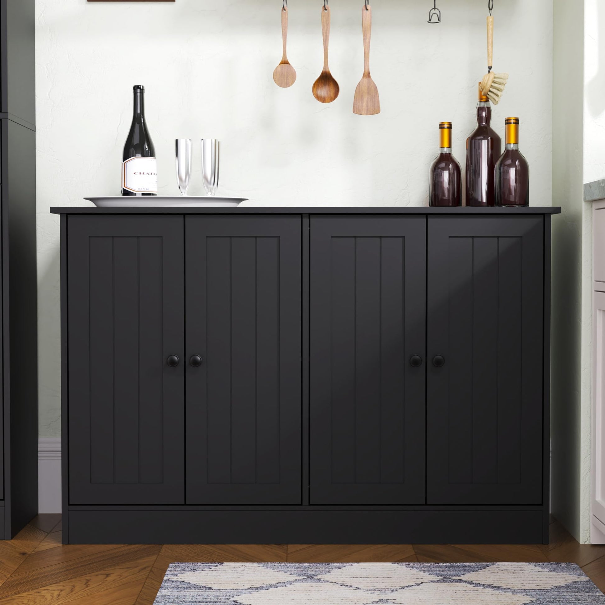 47" Sideboard Buffet Cabinet with 4 Doors, Modern Farmhouse Coffee Bar Storage Table for Kitchen, Dining, or Living Room, Black