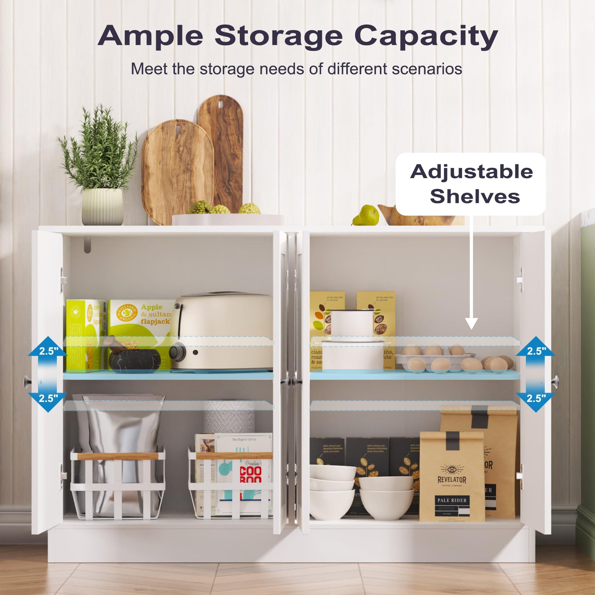47" Sideboard Buffet Cabinet with 4 Doors, Modern Farmhouse Coffee Bar Storage Table for Kitchen, Dining, or Living Room, White