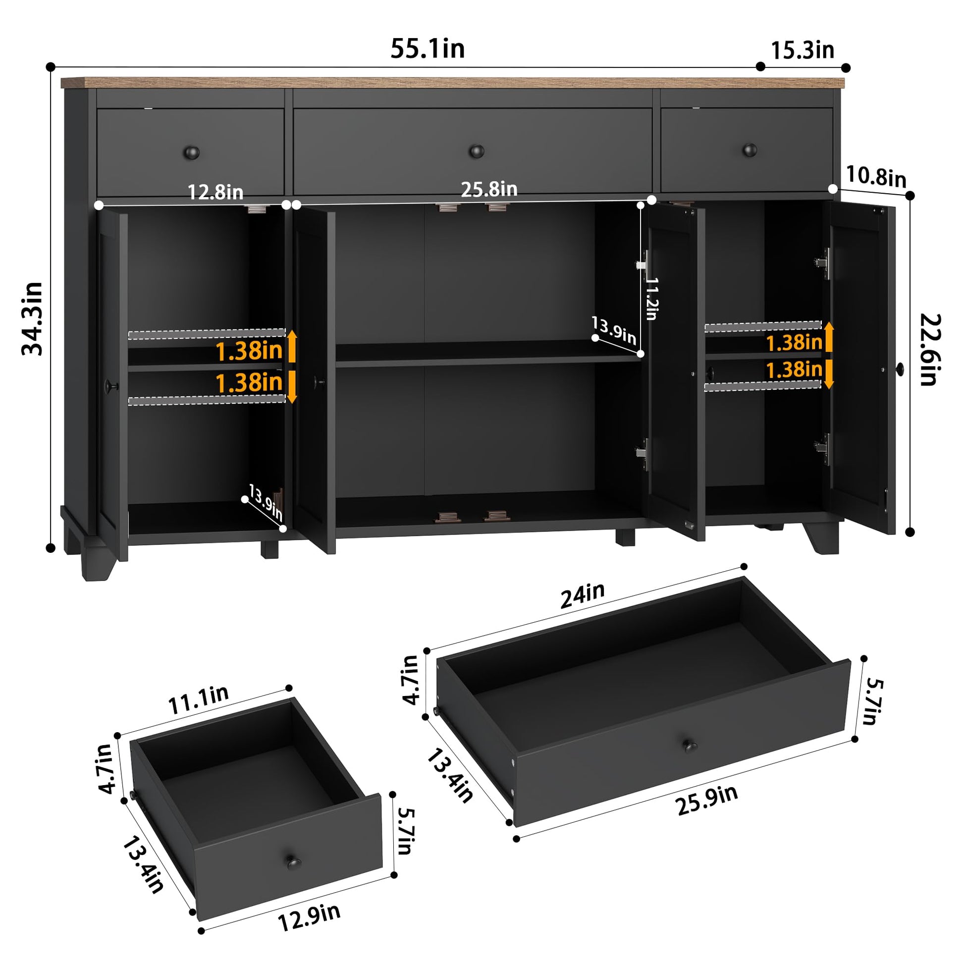 - SPACIOUS STORAGE SOLUTIONS: This kitchen cabinet features a 55" wide tabletop, which can accommodate a coffee machine, microwave and other daily necessities. With 3 large drawers, you can easily organize and store dishes, cups, paper towels, etc. At the same time, this buffet cabinet features a central double-door cabinet with fixed shelf and 2 side cabinets with adjustable shelves, which can easily accommodate all kitchen utensils
