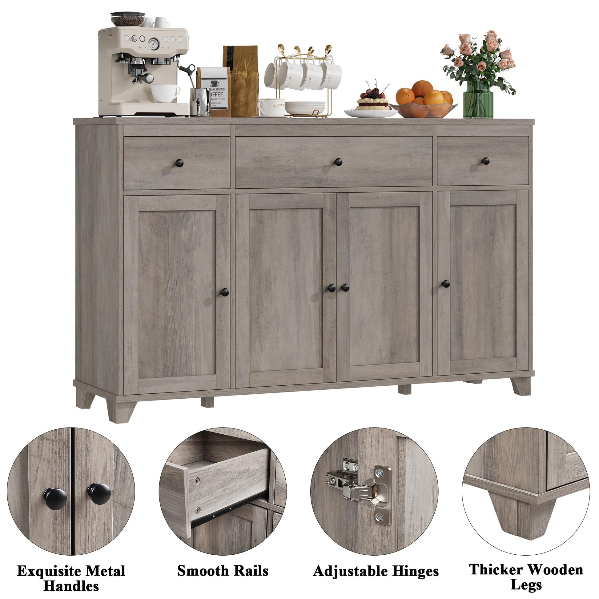 - SPACIOUS STORAGE SOLUTIONS: This kitchen cabinet features a 55" wide tabletop, which can accommodate a coffee machine, microwave and other daily necessities. With 3 large drawers, you can easily organize and store dishes, cups, paper towels, etc. At the same time, this buffet cabinet features a central double-door cabinet with fixed shelf and 2 side cabinets with adjustable shelves, which can easily accommodate all kitchen utensils