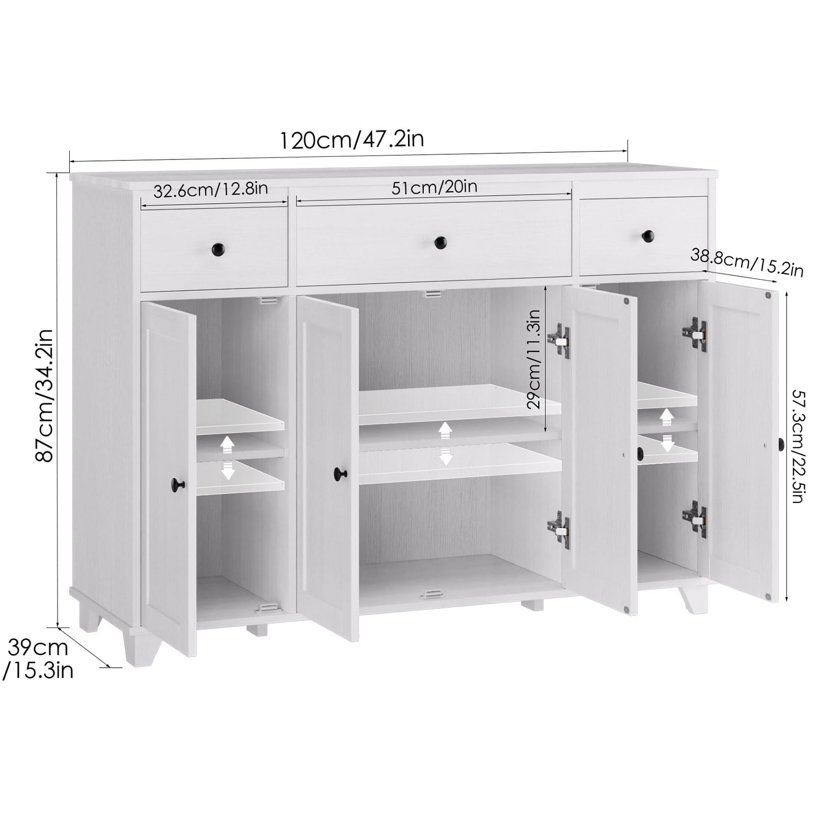 - LARGE KITCHEN BUFFET CABINET: 47.2"W x 15.3"D x 34.2"H. The buffet cabinet features a spacious tabletop, three storage drawers, and four cabinet doors to store some wine bottles, seasoning cans, cutlery, food, pots, and even coffee machines, etc. In addition, the 3 shelves are adjustable, so you can adjust the height according to your needs. Our buffet cabinet with storage will keep your kitchen and dining room clean and tidy
