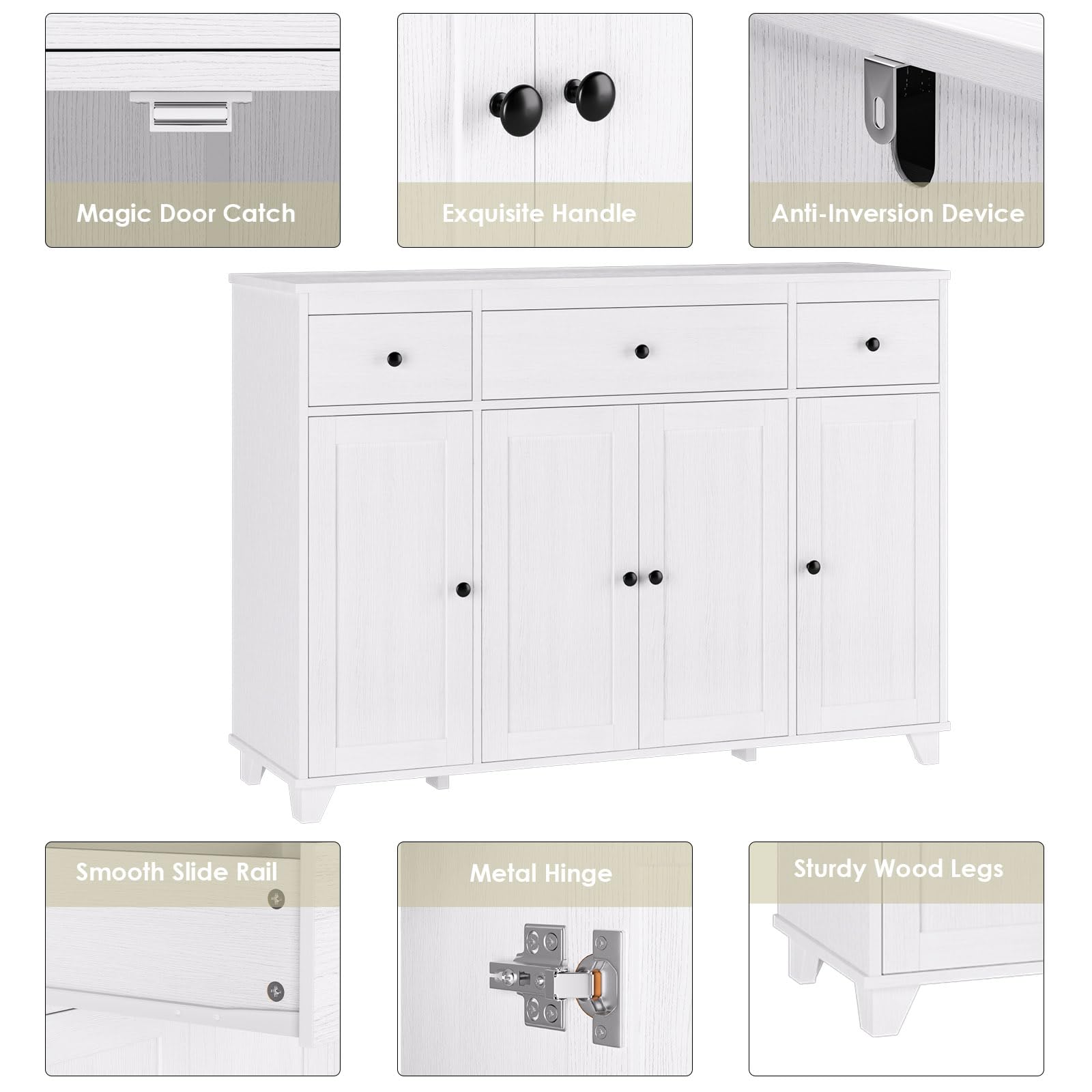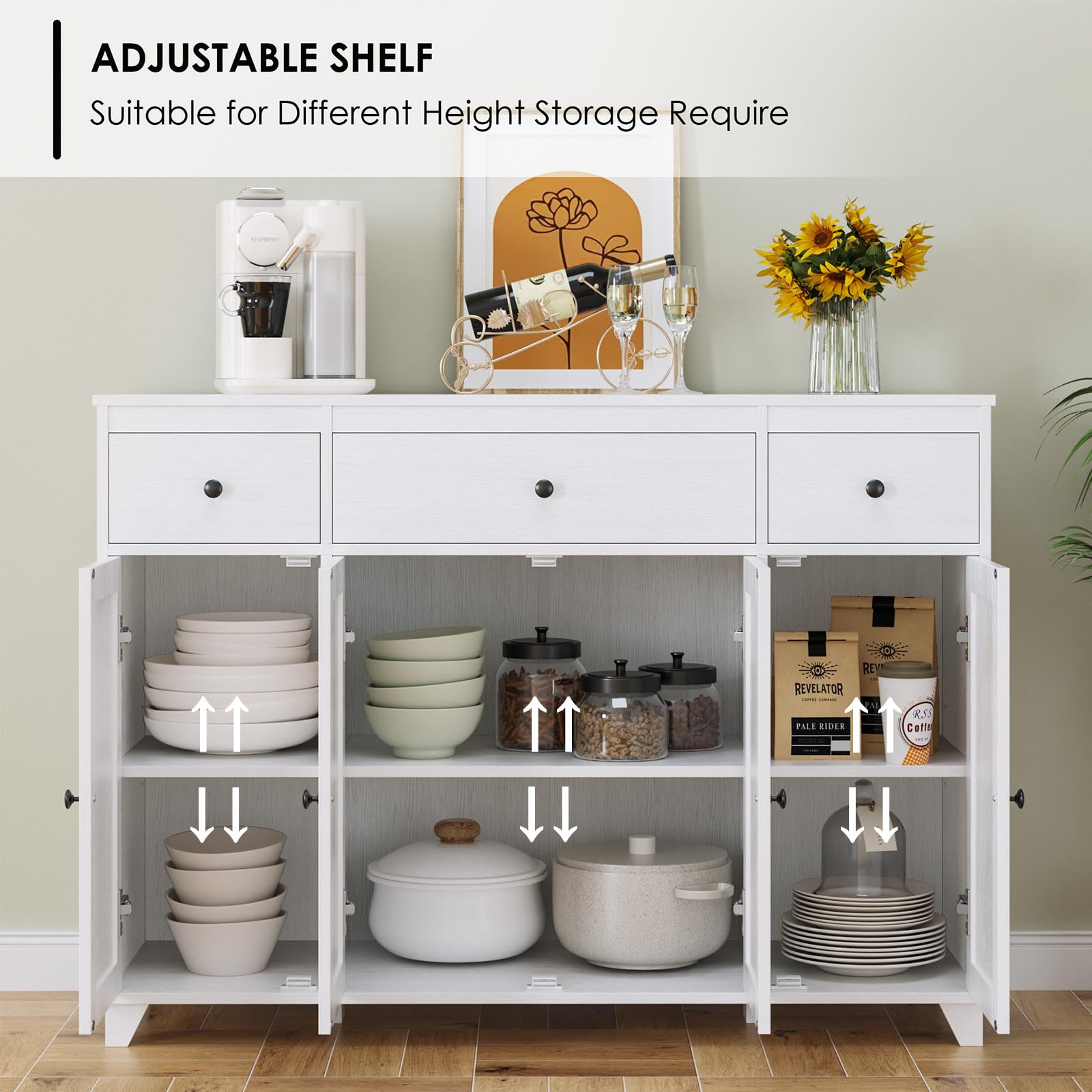 47" White Buffet Cabinet with 3 Drawers, 4 Doors, and Adjustable Shelves, Modern Coffee Bar Sideboard for Kitchen, Dining, or Living Room