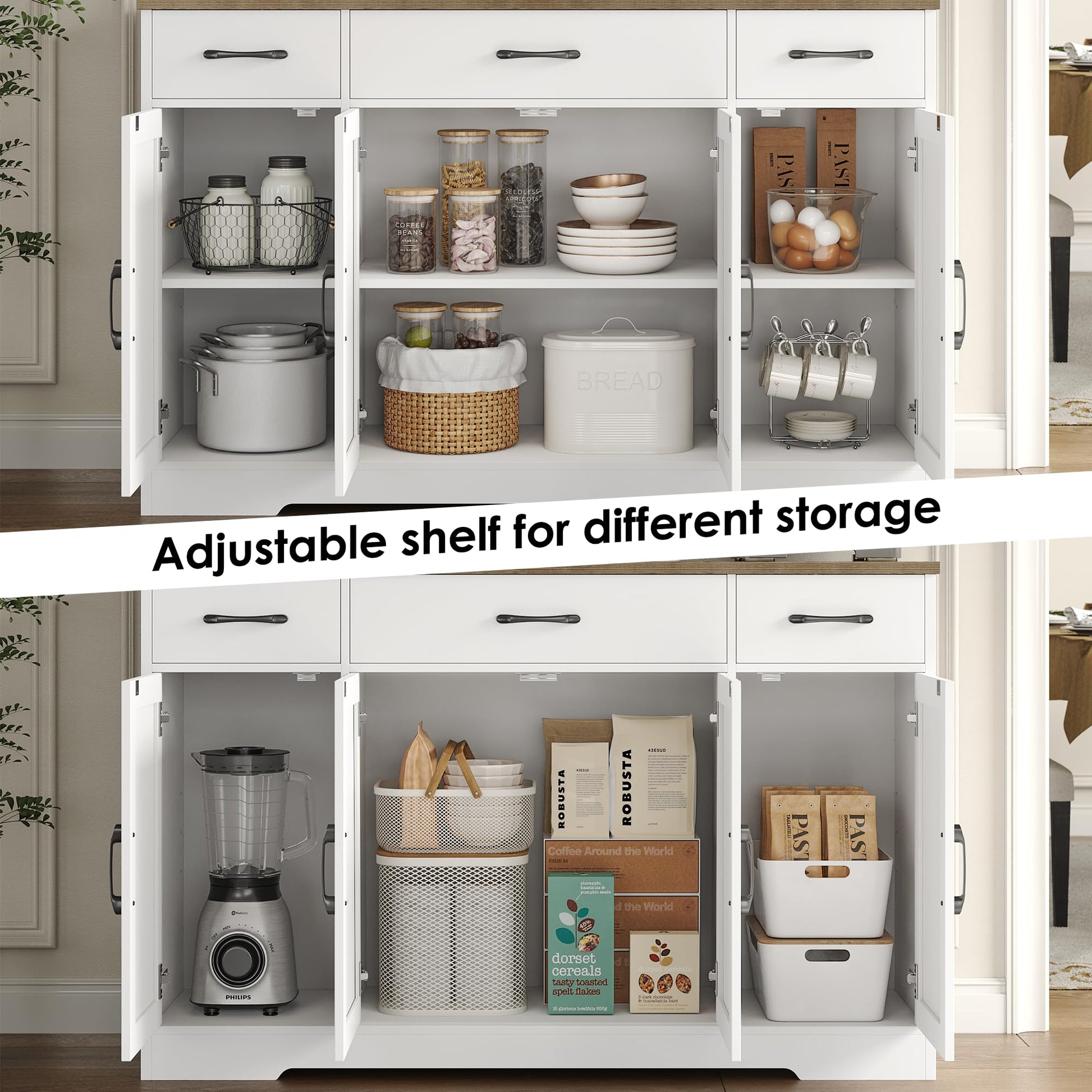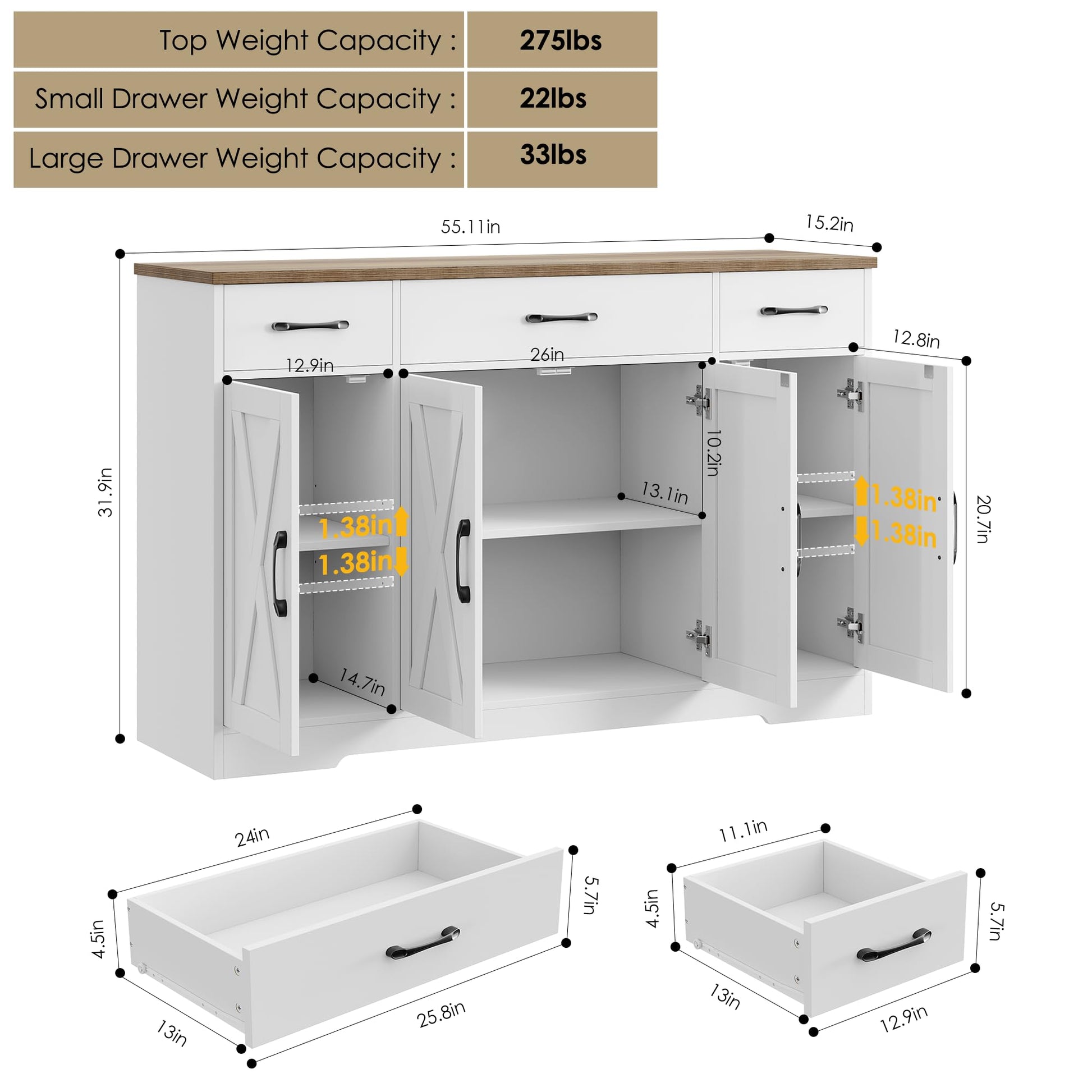 55" Large Buffet Sideboard Cabinet with Drawers, Shelves, and Doors, Modern Farmhouse Coffee Bar Station for Kitchen or Dining Room, White/Rustic