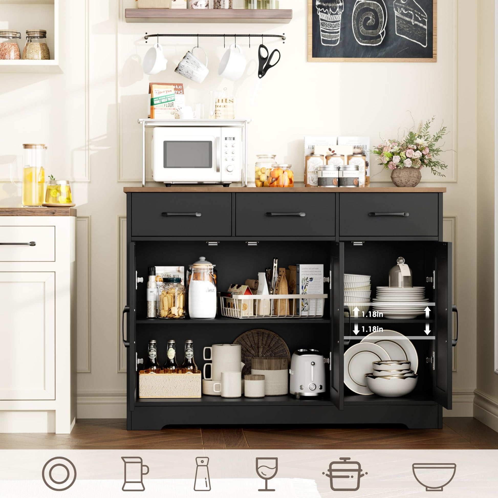 - Ample Storage Space: The buffet cabinet incorporates both open and closed storage space to meet your different needs. Spacious tabletop can place items for easy access, three handy drawers help classify knives and forks neatly, while two bottom cabinets each with internal shelf offer smart space to accommodate mugs, extra dishware, and other essentials
