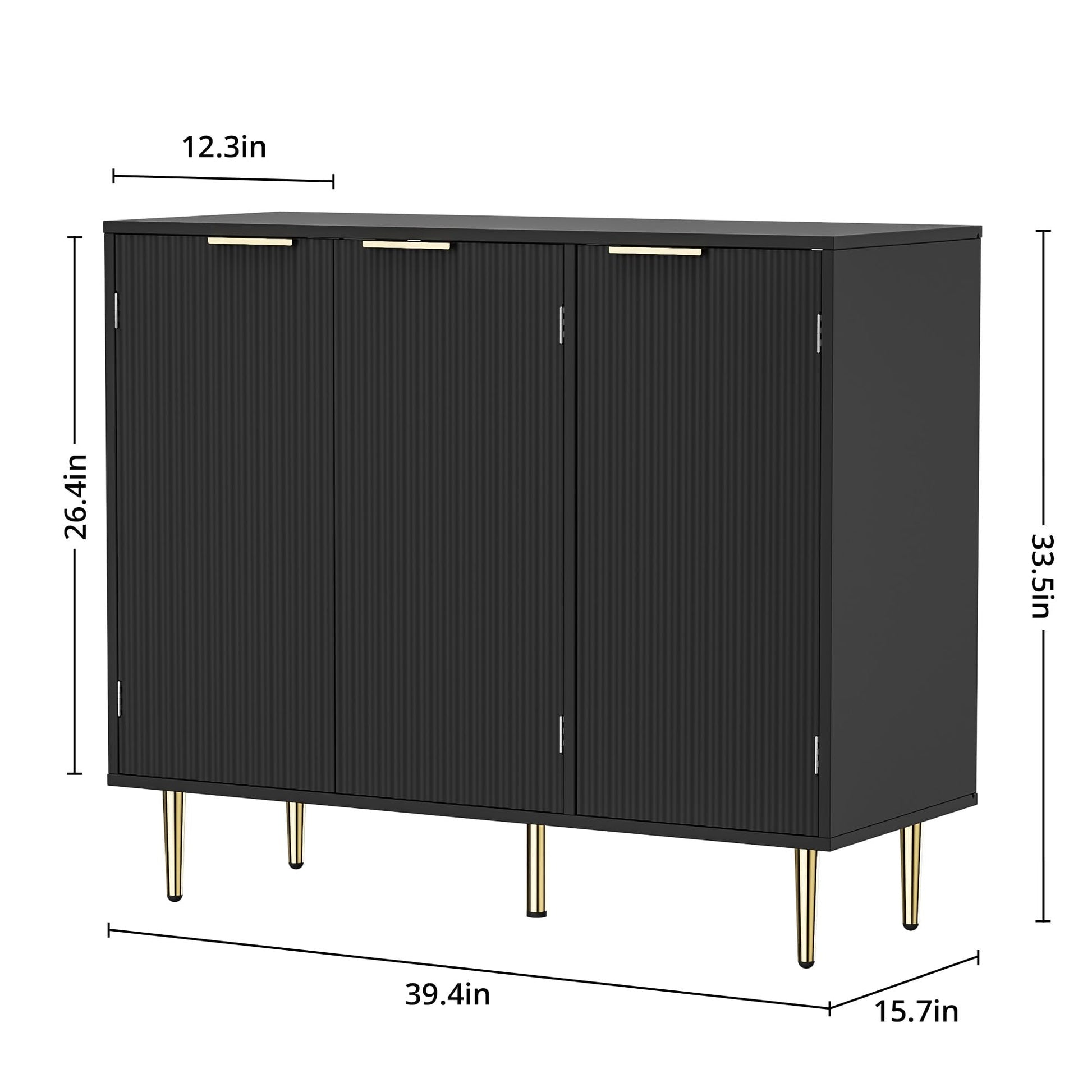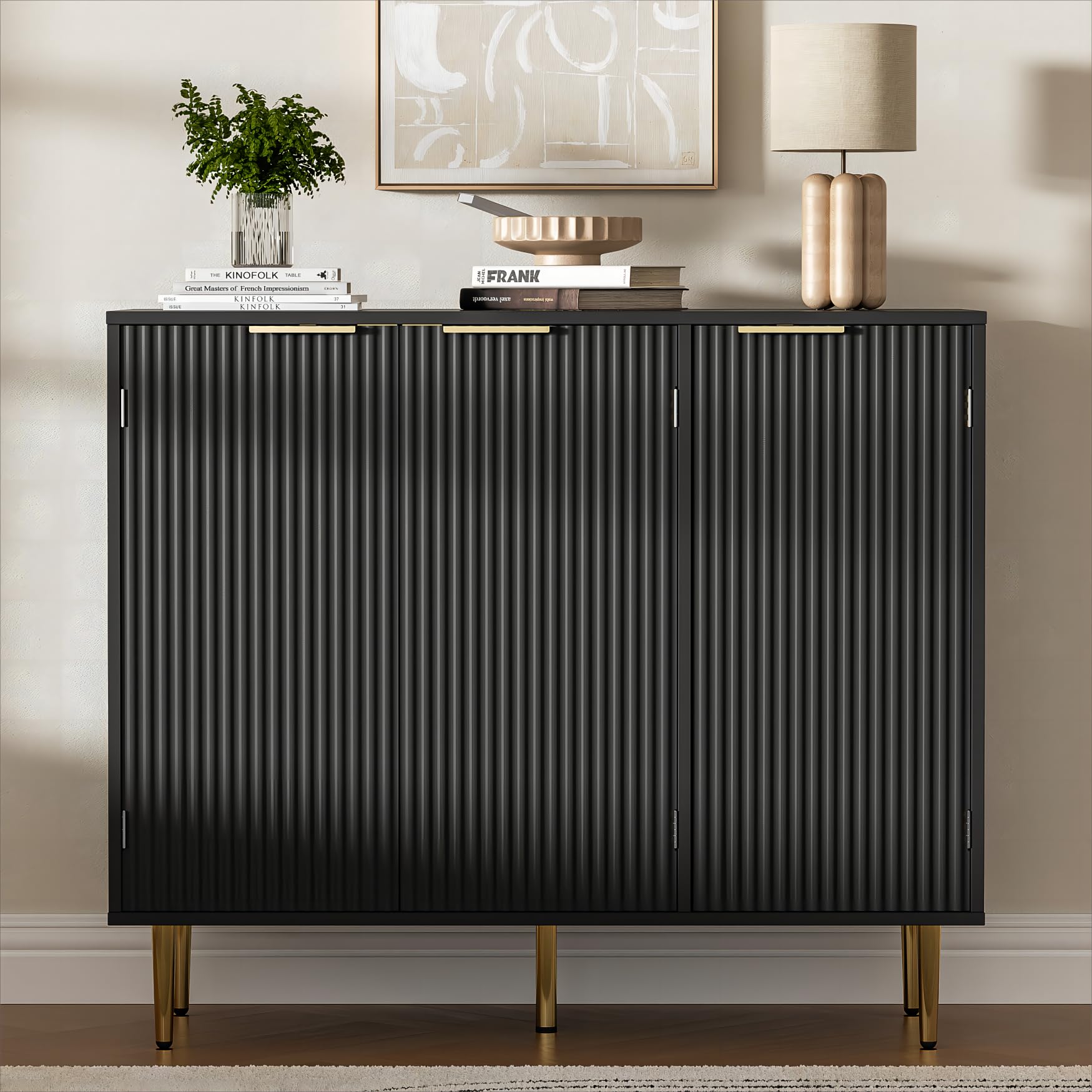 Fluted Sideboard Buffet with 3 Doors and Adjustable Shelves, Modern Kitchen Storage Cabinet with Gold Handles, Coffee Bar for Living Room or Kitchen, Black