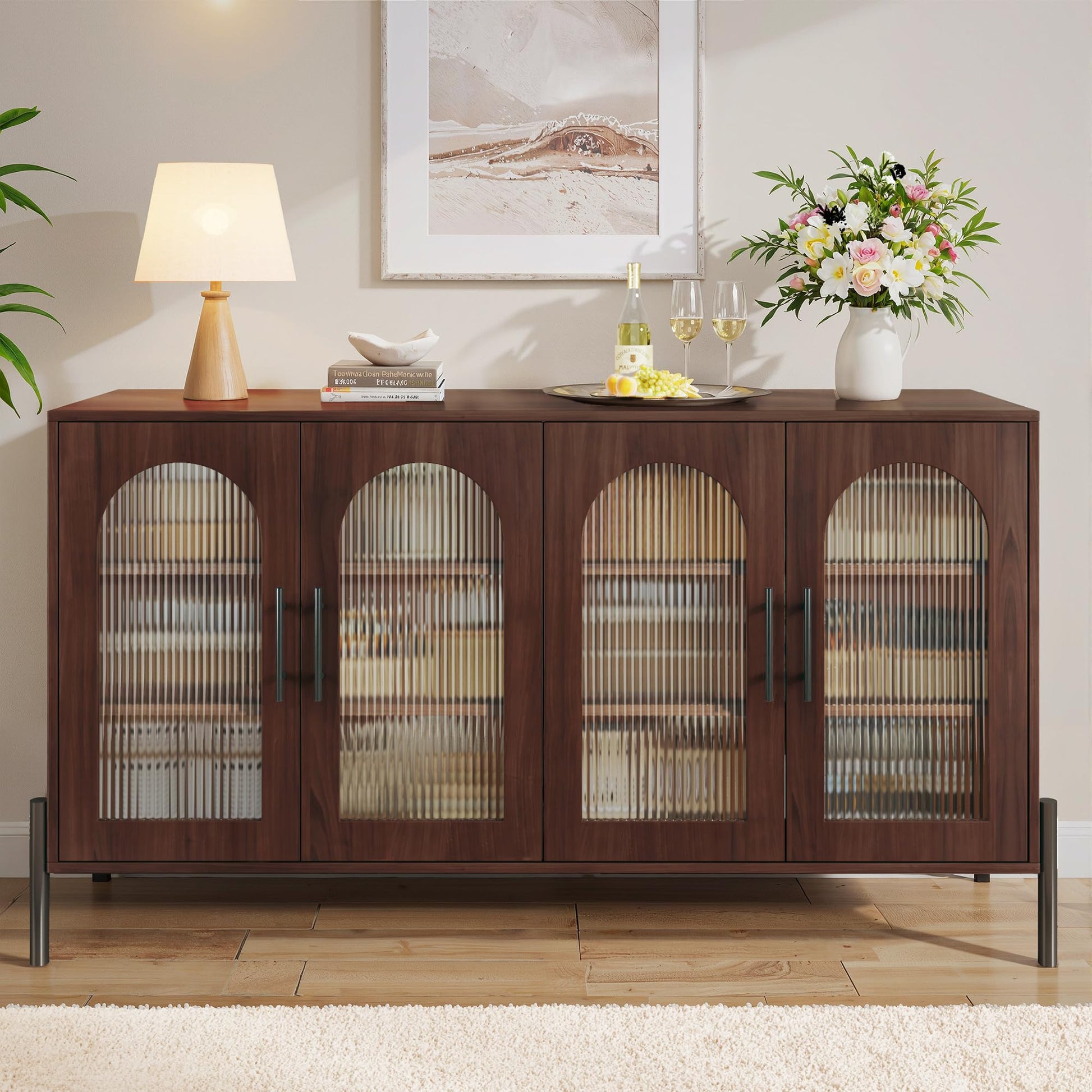 55" Modern Sideboard Buffet Cabinet with 4 Fluted Acrylic Doors and Adjustable Shelves, Wood Console Table for Living Room or Kitchen, Dark Walnut