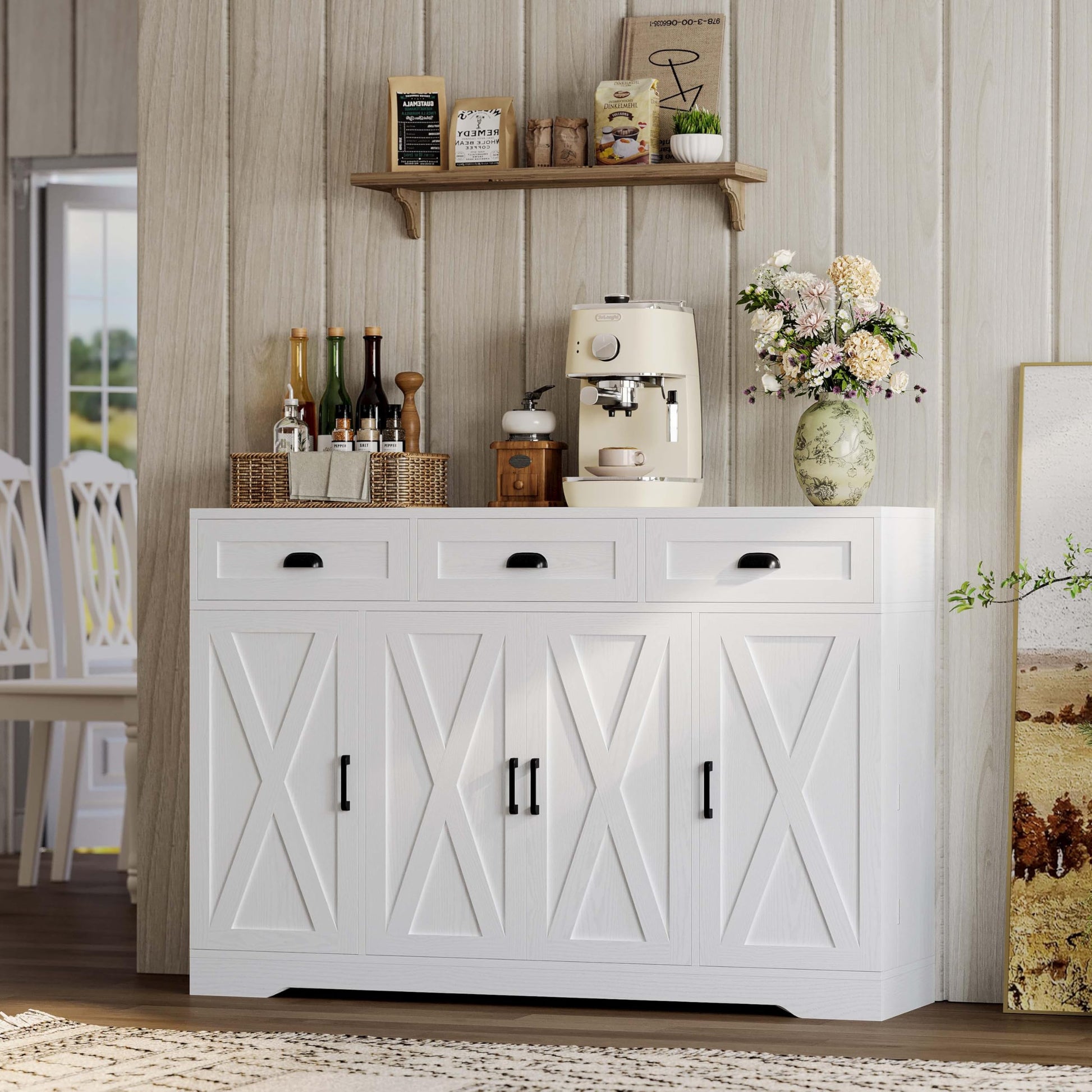 Buffet Cabinet with 4 Doors, 3 Drawers, and 6 Adjustable Shelves, Modern Sideboard Coffee Bar Storage for Kitchen or Dining Room, White