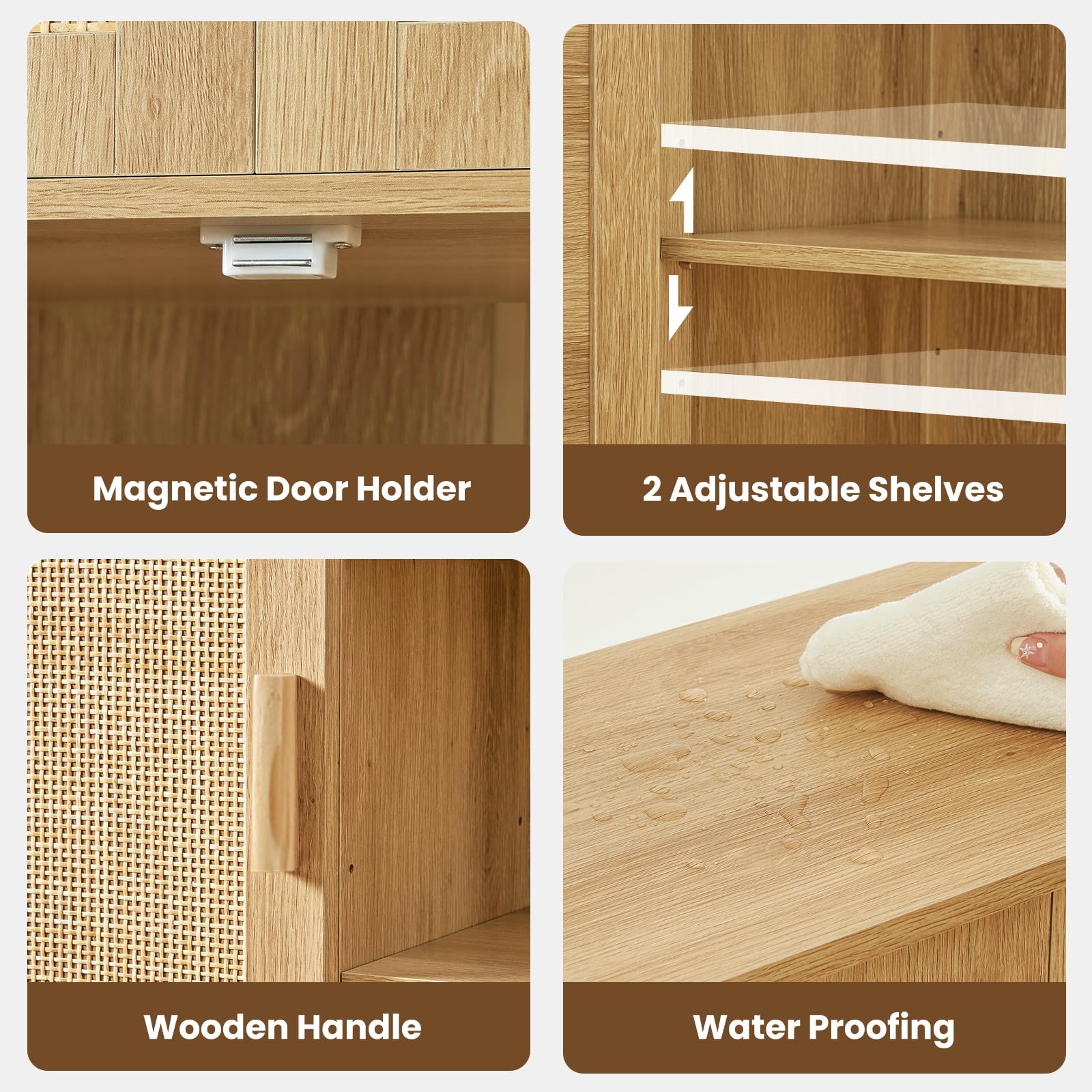 Rattan Storage Cabinet with 4 Adjustable Shelves, Coffee Bar Sideboard Buffet for Kitchen, Living Room, or Entryway, Natural