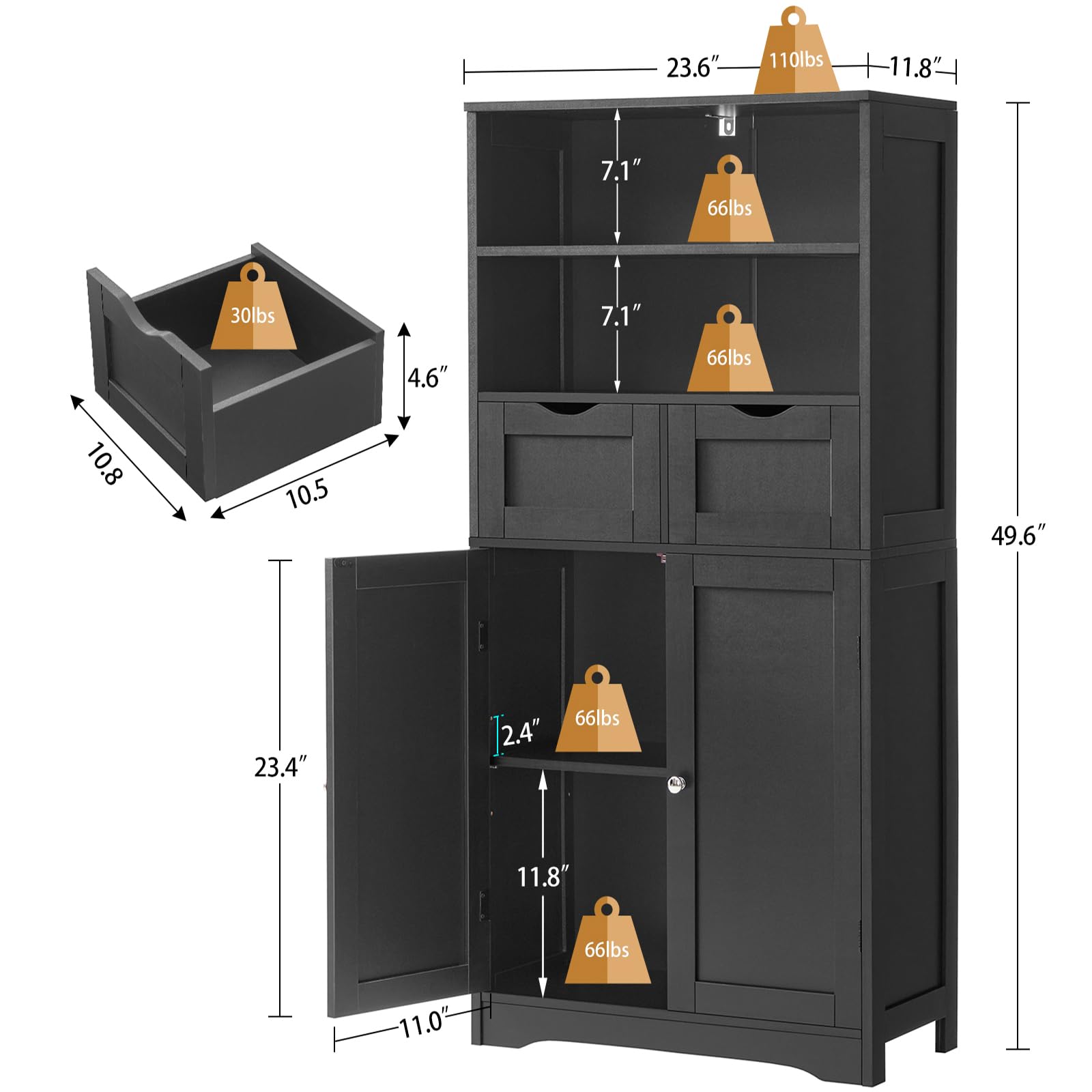 Tall Storage Cabinet with 2 Drawers and Adjustable Shelves, Black Bathroom or Living Room Cabinet for Dining Room or Entryway