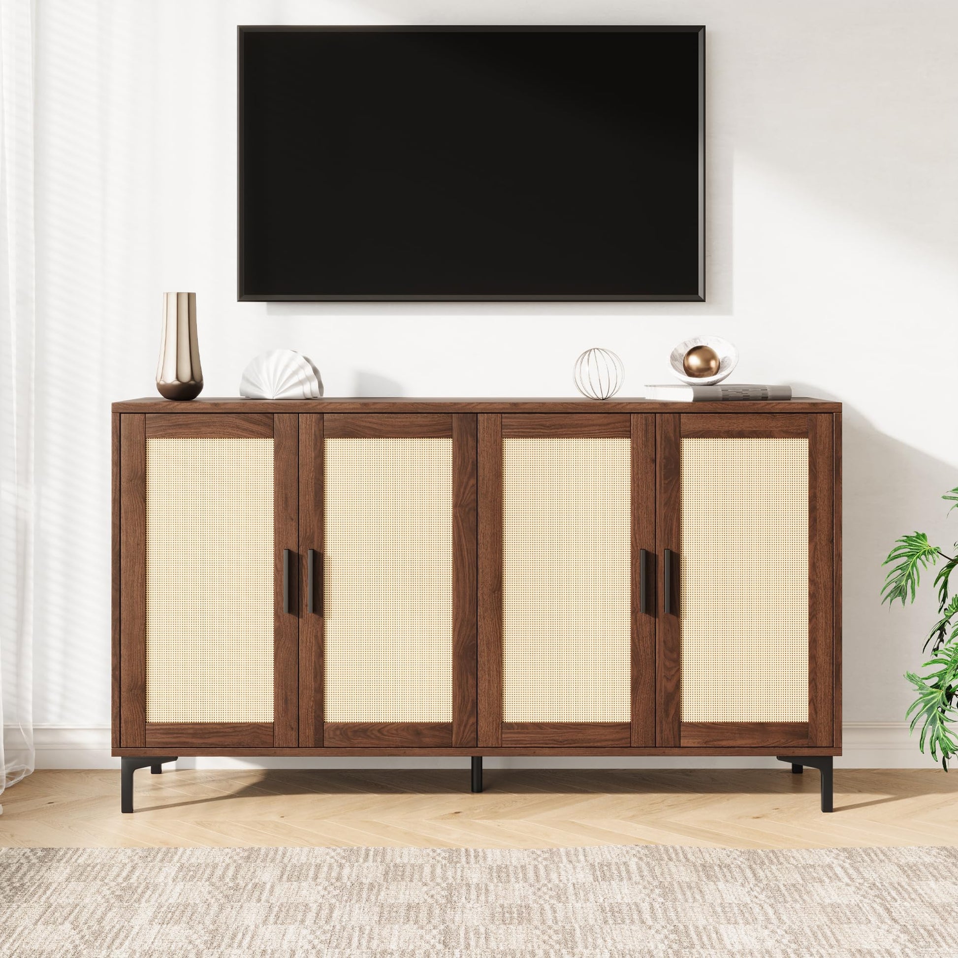 **JASIWAY Modern Rattan Sideboard Buffet Cabinet, 42"W x 34.66"H x 15"D, Brown, 4-Door Kitchen Buffet Cabinet with 3 Adjustable Shelves, Accent Storage for Dining Room and Living Room**