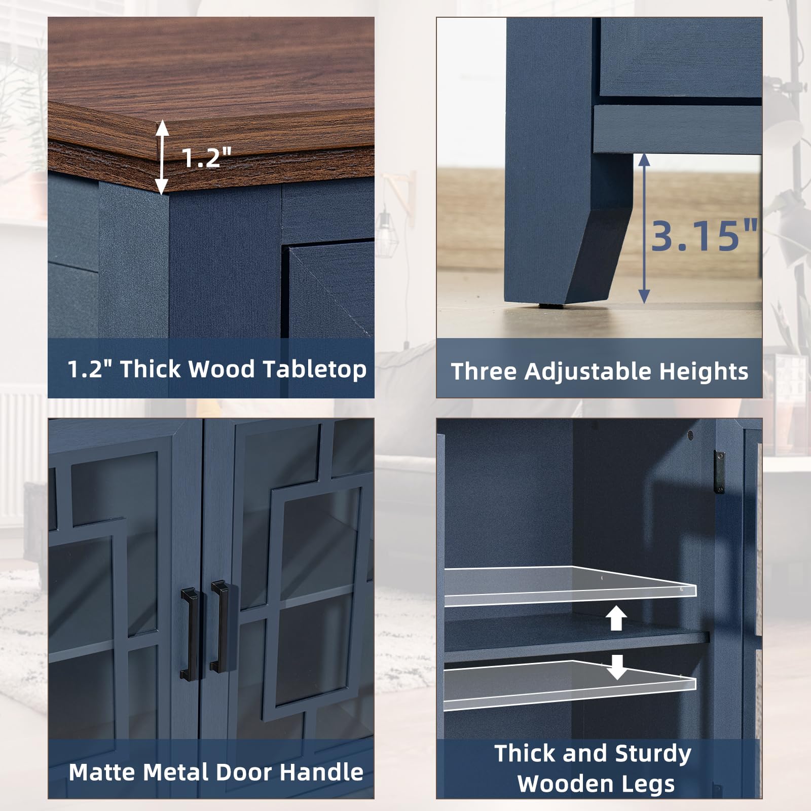 **63" Large Farmhouse Sideboard Buffet Cabinet with Storage, Navy Blue Wood Coffee & Wine Bar Cabinet with 4 Glass Doors, Mid-Century Modern Sideboard for Dining Room or Living Room**