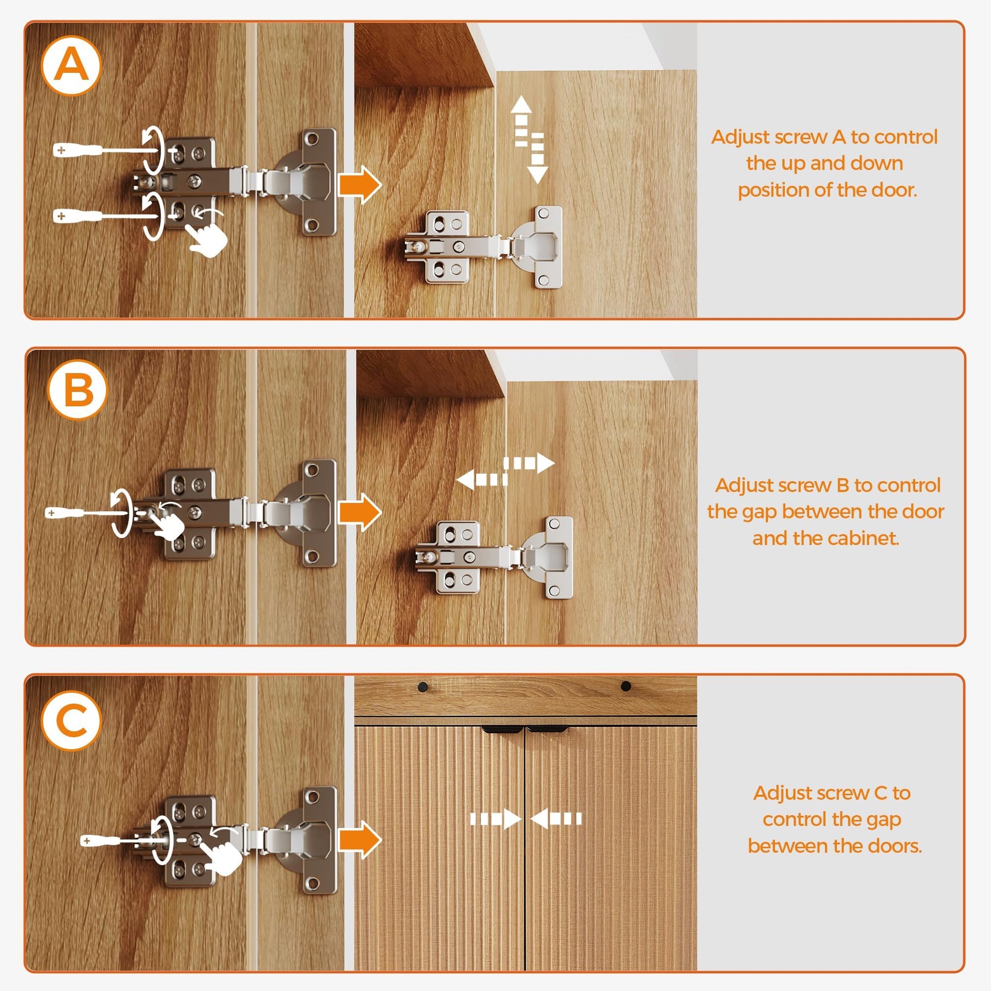 - 【Installation tips】 If the door panel is uneven or has gaps after assembly, refer to the manual to adjust the hinge screws; in addition, firmly fix the small fasteners on the cabinet back panel and tighten them at a 45-degree angle to help increase overall stability.