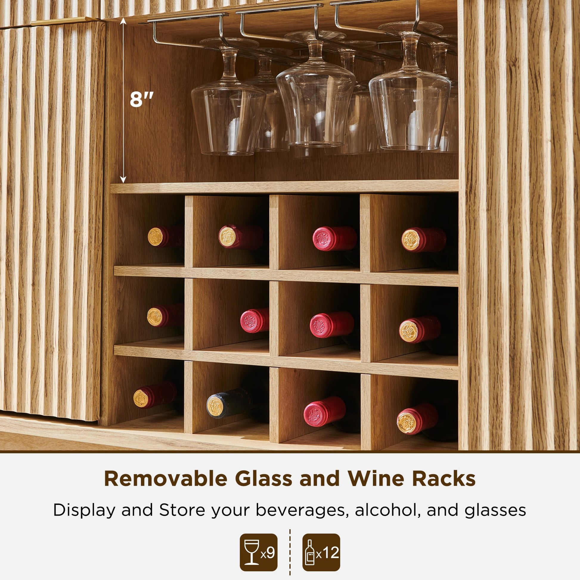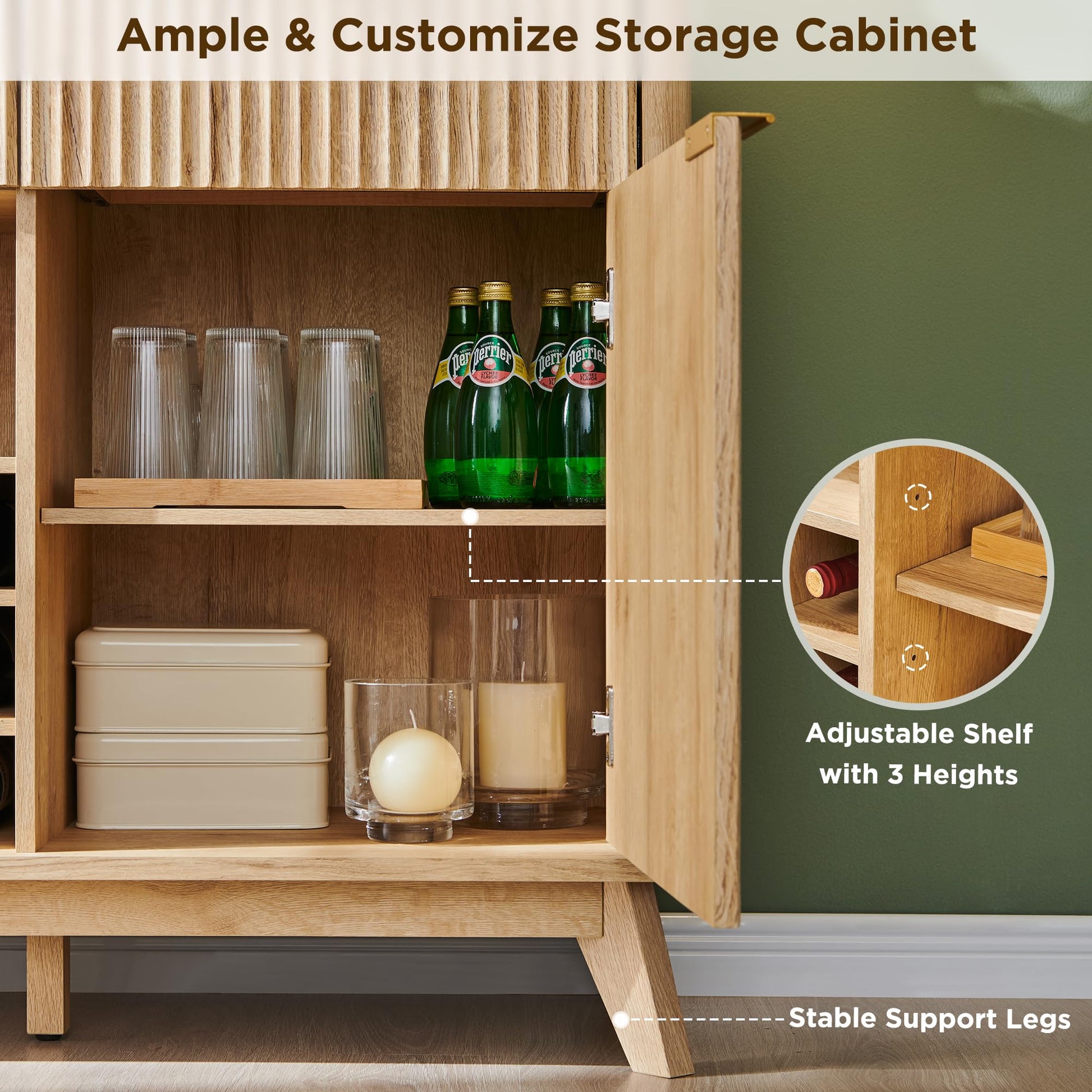 60" Fluted Buffet Cabinet with 3 Drawers and 2 Doors, Modern Wine and Coffee Bar Sideboard with Wine and Glass Racks, Adjustable Shelves for Kitchen or Dining, Natural Oak