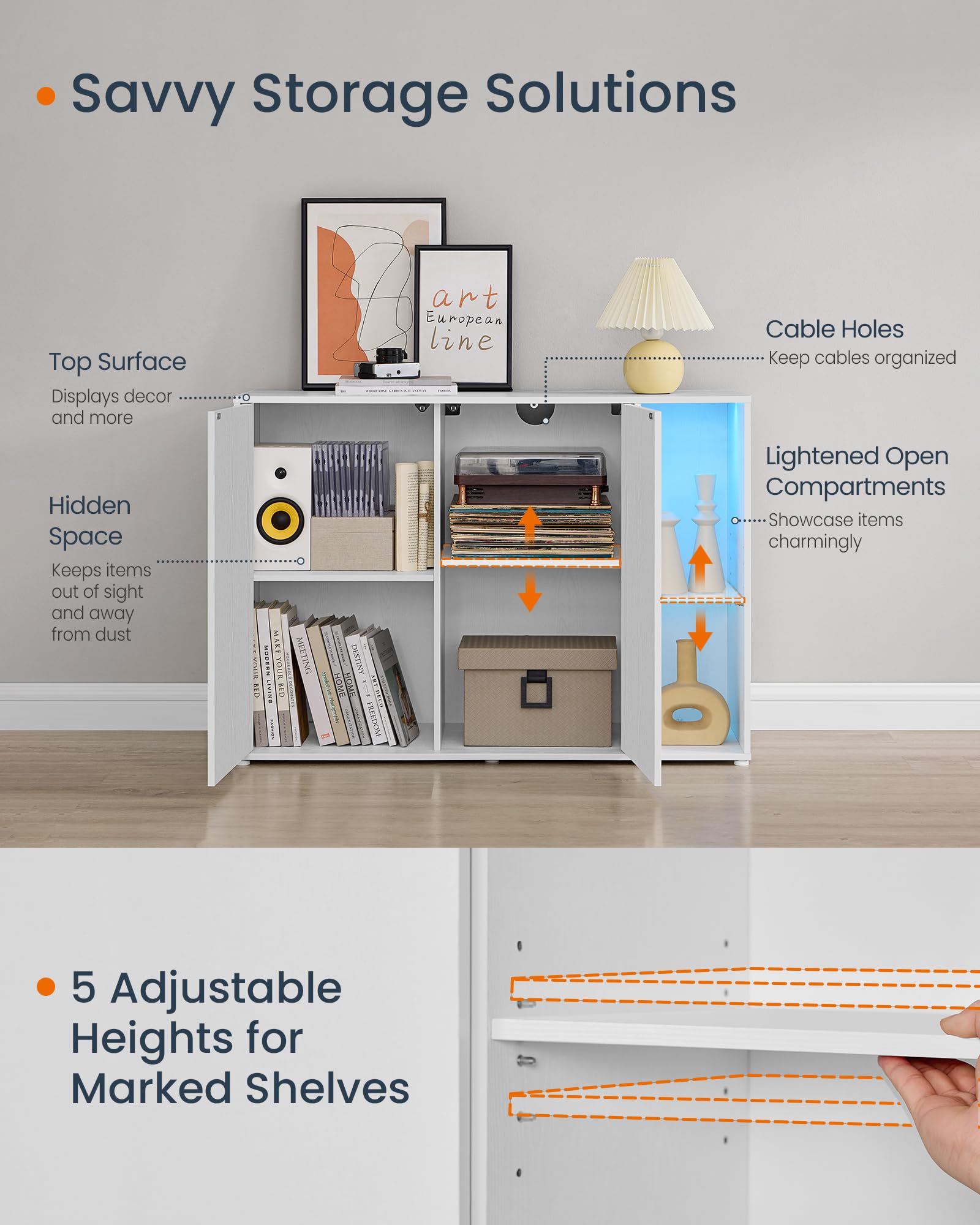 - 【ADJUSTABLE SHELVES & CABLE MANAGEMENT】Featuring 5 height levels for the glass shelf and interior right shelf, this TV cabinet can accommodate items of varying heights. The back panel includes cable holes for neat organization of electronics