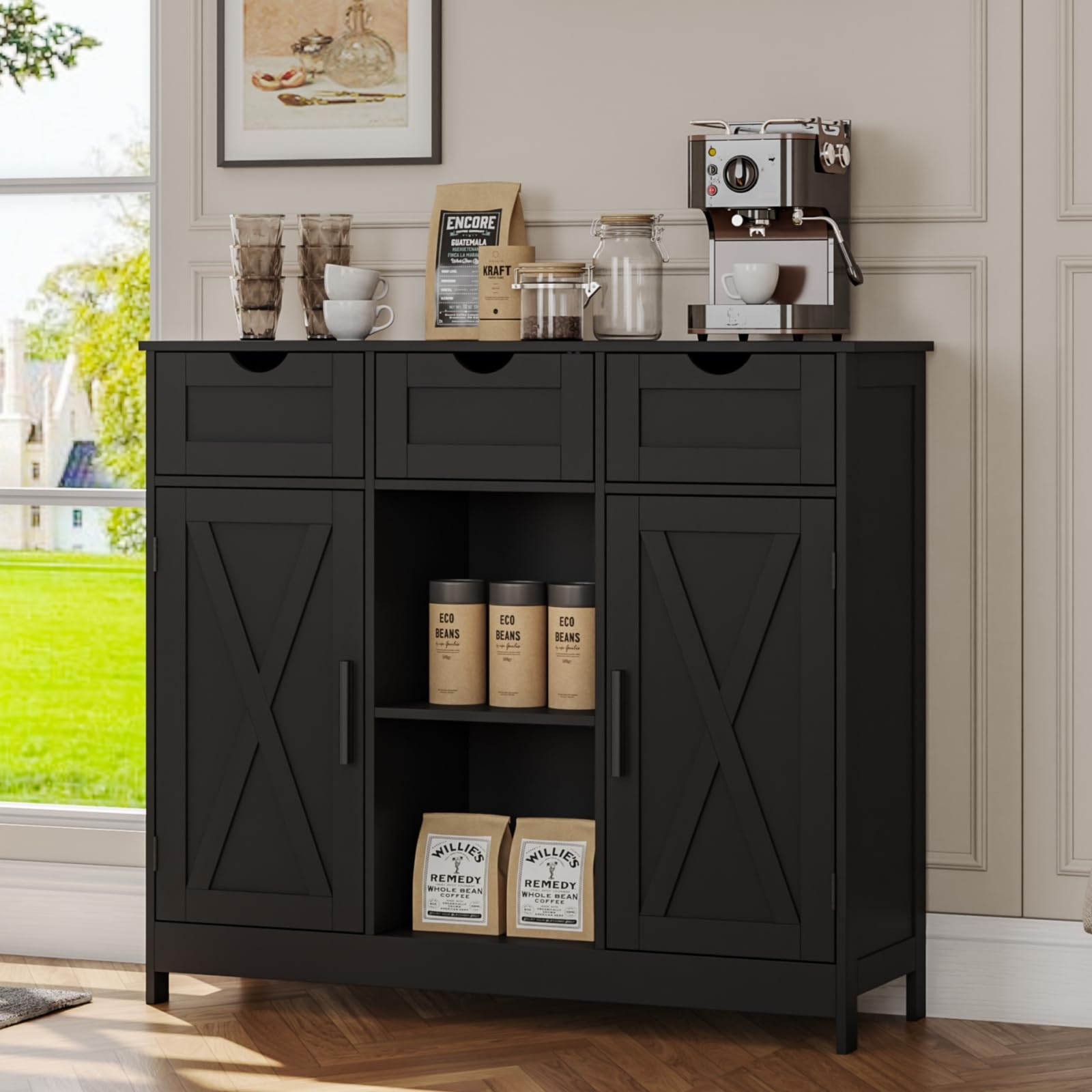 Storage Cabinet with 2 Doors, 3 Drawers, and 2 Adjustable Shelves, Coffee Bar Sideboard for Bathroom, Kitchen, or Living Room, Black