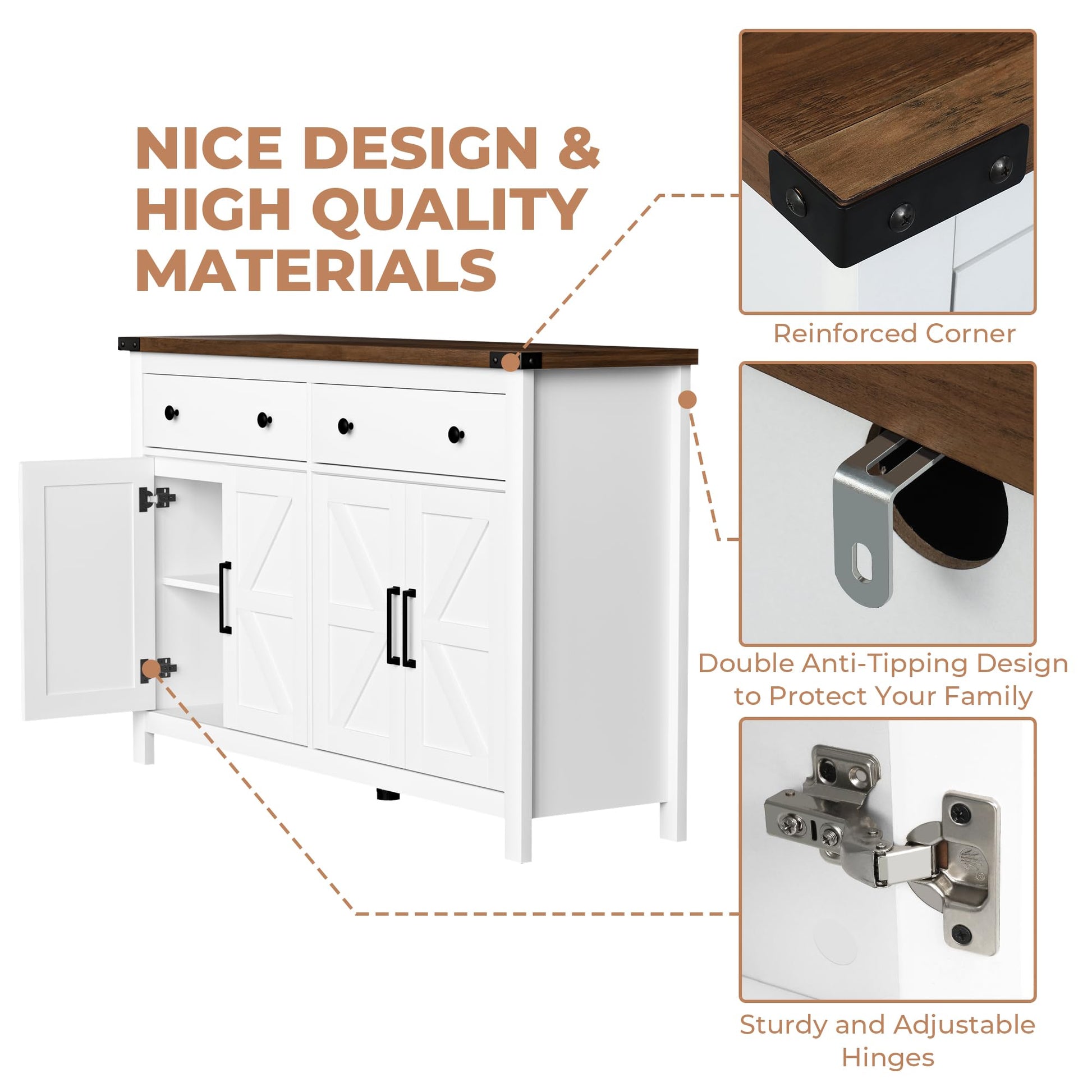 - 【Better Wood】Thicker and Denser Wood. The coffee bar cabinet with 2 drawers and 4 barn doors is made from thicker MDF wood.The material with higher density is sturdier and smoother, largely reducing the likelihood of scratching, peeling and cracking.