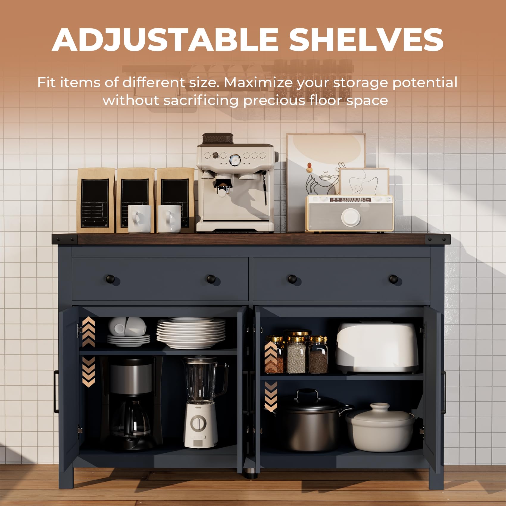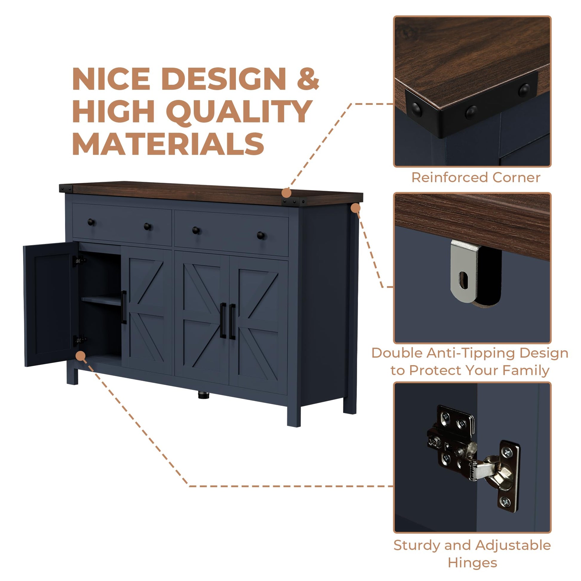 Farmhouse Buffet Cabinet with Storage, 55" Large Sideboard with 4 Doors & 2 Drawers, Blue Wood Coffee Bar Cabinet for Kitchen, Dining Room & Living Room