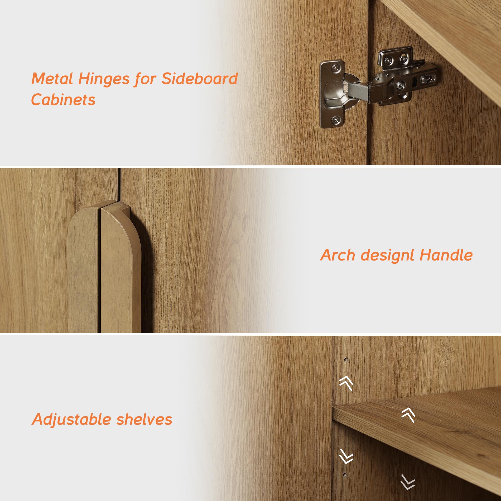 - Rounded Handles & Adjustable Shelves: With unique rounded handles and smooth curved edges, this modern sideboard adds a soft, refined aesthetic. Each cabinet features a built-in shelf that can be adjusted to three different heights, making it easy to store items of varying sizes—from tall pitchers to small plates.