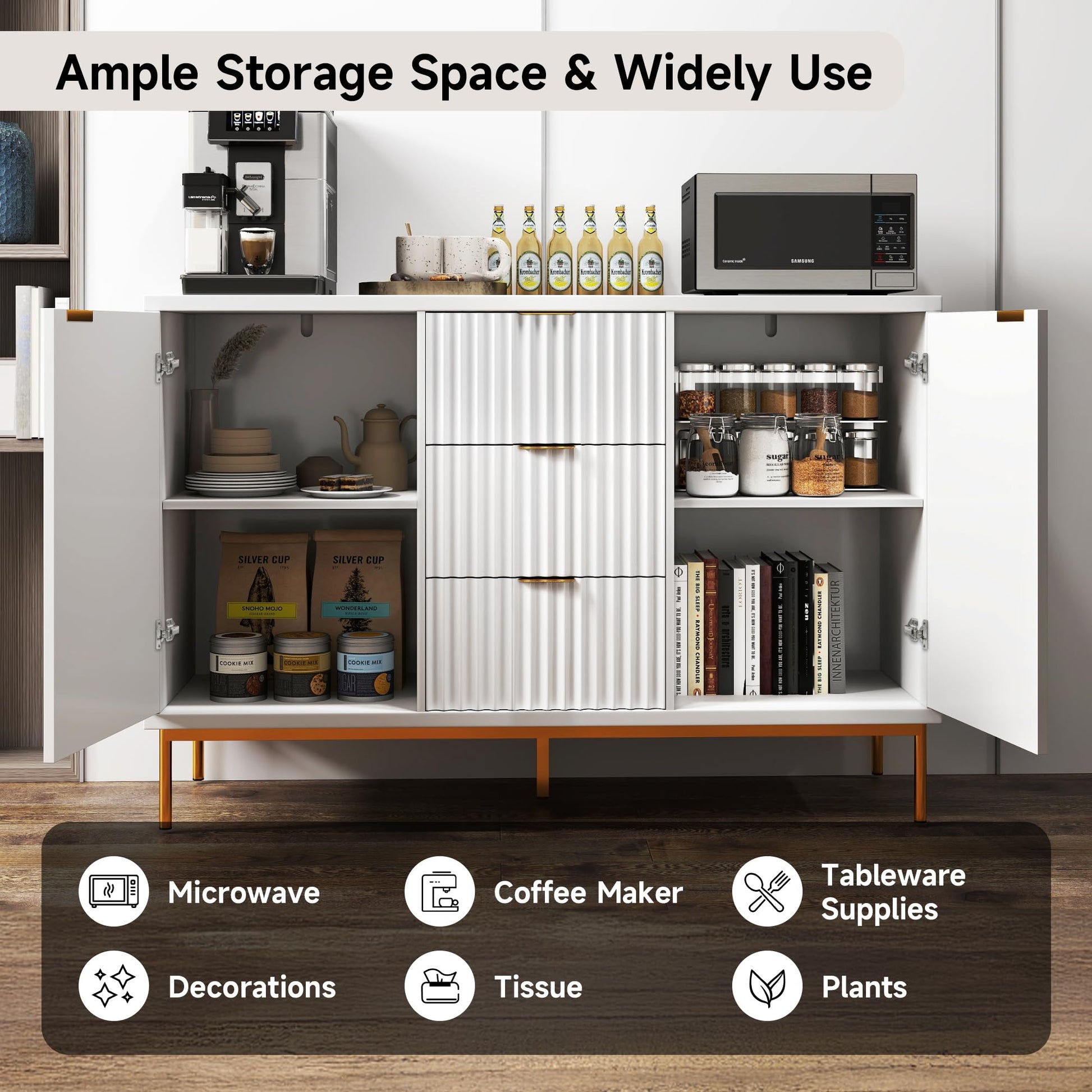 Fluted Buffet Cabinet with 2 Doors, 3 Drawers and Adjustable Shelf, 47" Modern Sideboard Coffee Bar Table for Kitchen and Living Room, White